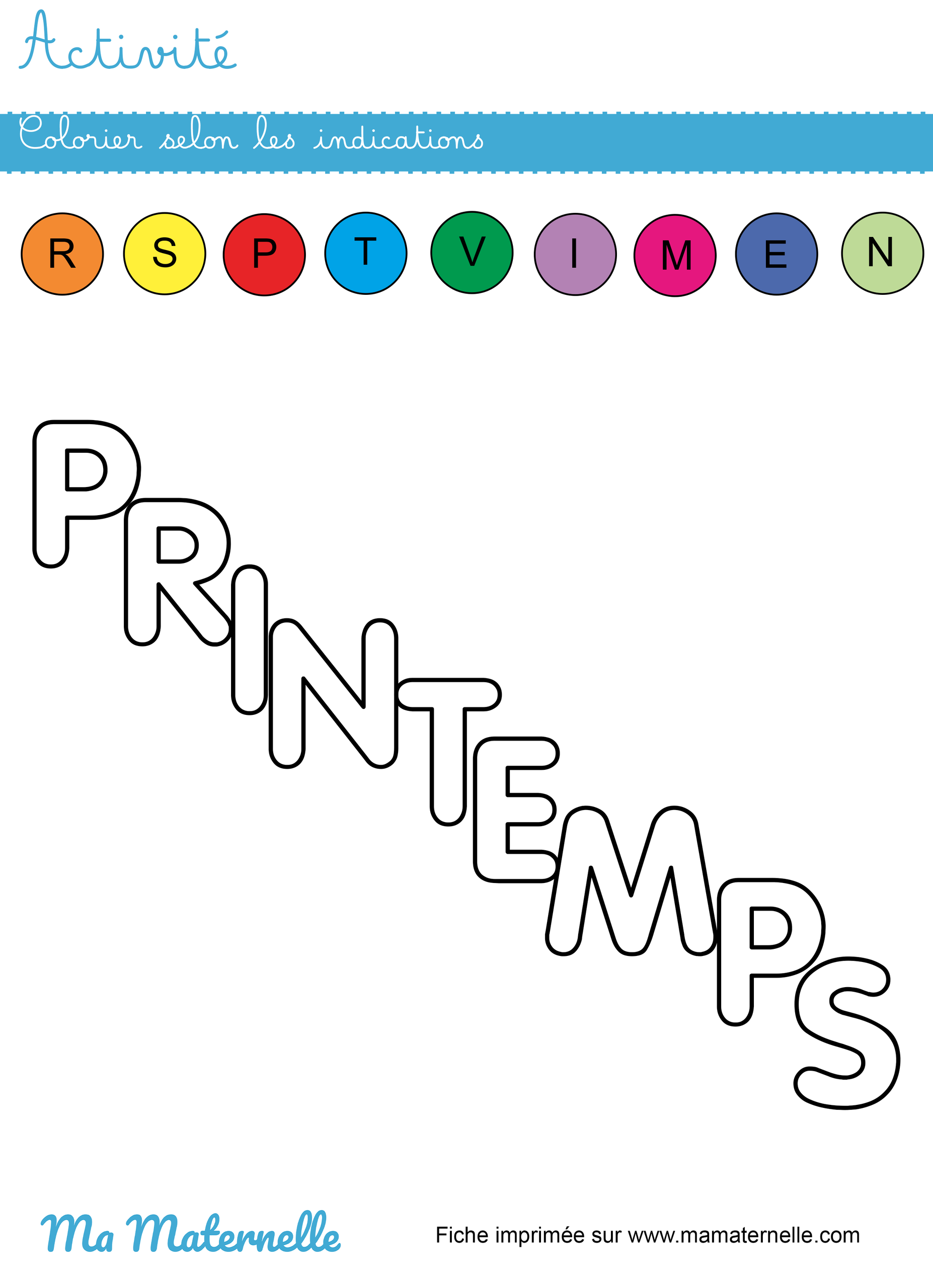 Colorier selon les indications le mot « printemps ».
