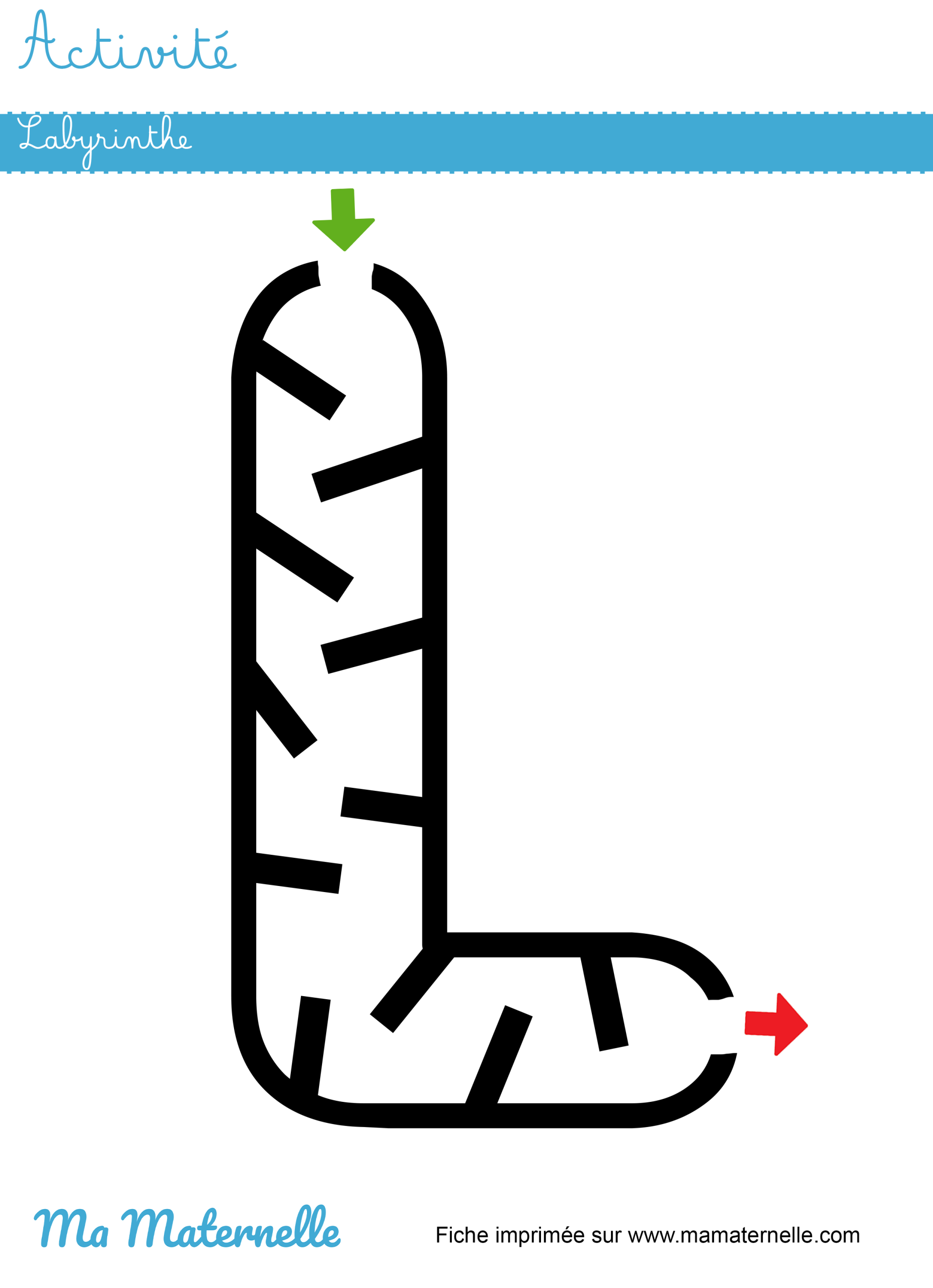 Objectif : travailler la motricité fine en se déplaçant dans le labyrinthe à l’aide de son crayon, avec un petit clin d’oeil aux différentes lettres de l’alphabet.