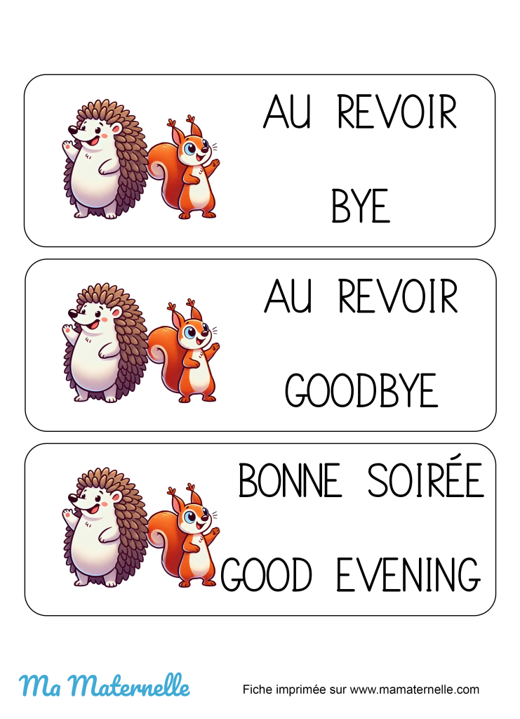 Affichage : au revoir en anglais Par JulieLe 11 novembre 2024Dans Activités, Outils pédagogiquesLaisser un commentaire sur Affichage : au revoir en anglais Affichage pour la maison ou la classe avec les formules de politesse pour dire au revoir en anglais. ↓ Télécharger le fichier Partager : 📎 Fiches similaires : Lettres : entourer les lettres dans les mots Activité : découper et coller Cartes de nomenclature : les couleurs en anglais Affichage : les jours de la semaine