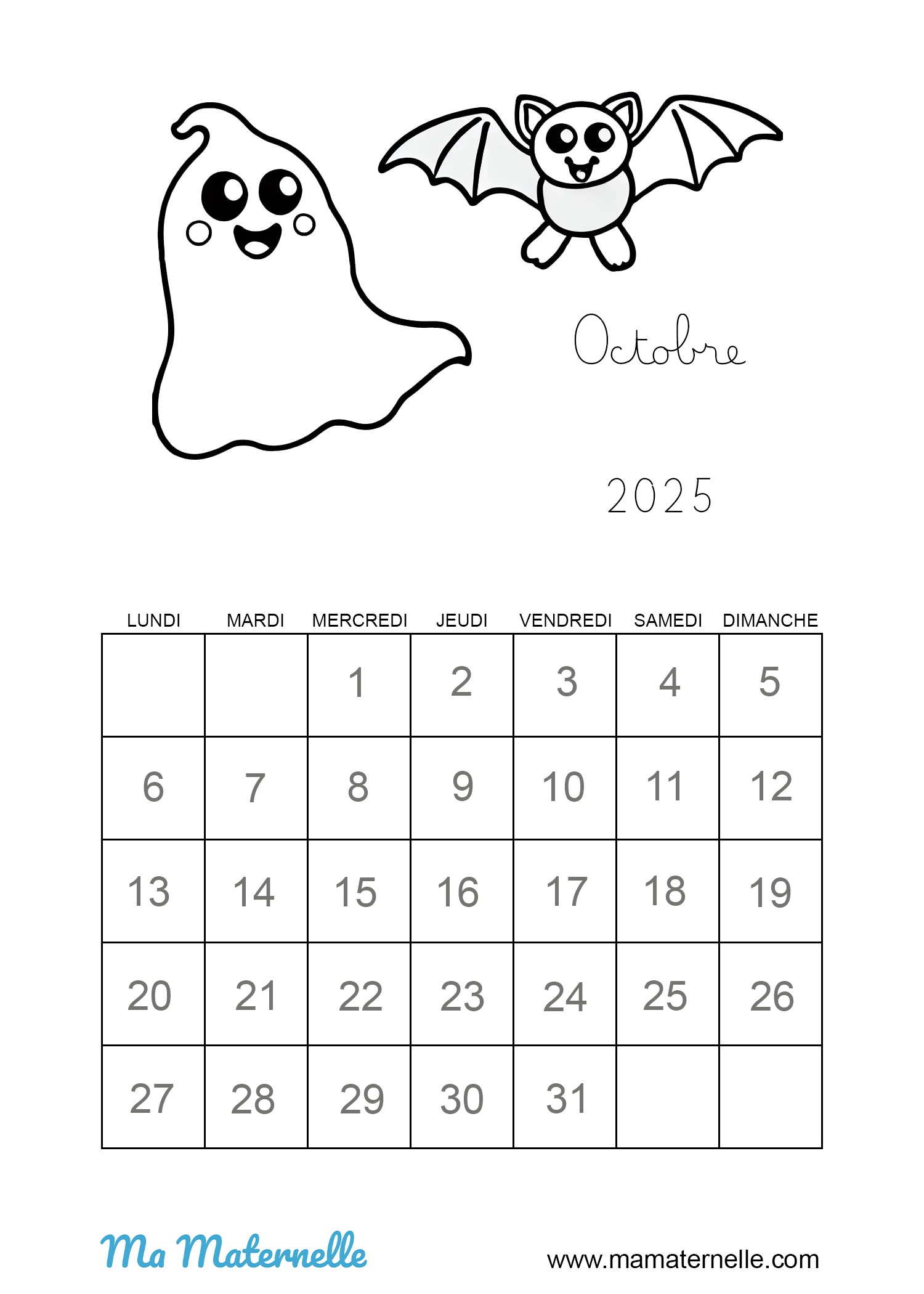 Voici le calendrier du mois d’octobre 2025 à colorier. À l’école il est parfois proposé aux enfants ce type de calendrier à cases afin de les aider à se repérer dans le temps. Chaque jour les petits élèves pourront faire une croix à la bonne date. Vous pouvez également y ajouter leurs activités à chaque date (sport, sorties…) les anniversaires, les fêtes, votre programme pour les vacances etc…