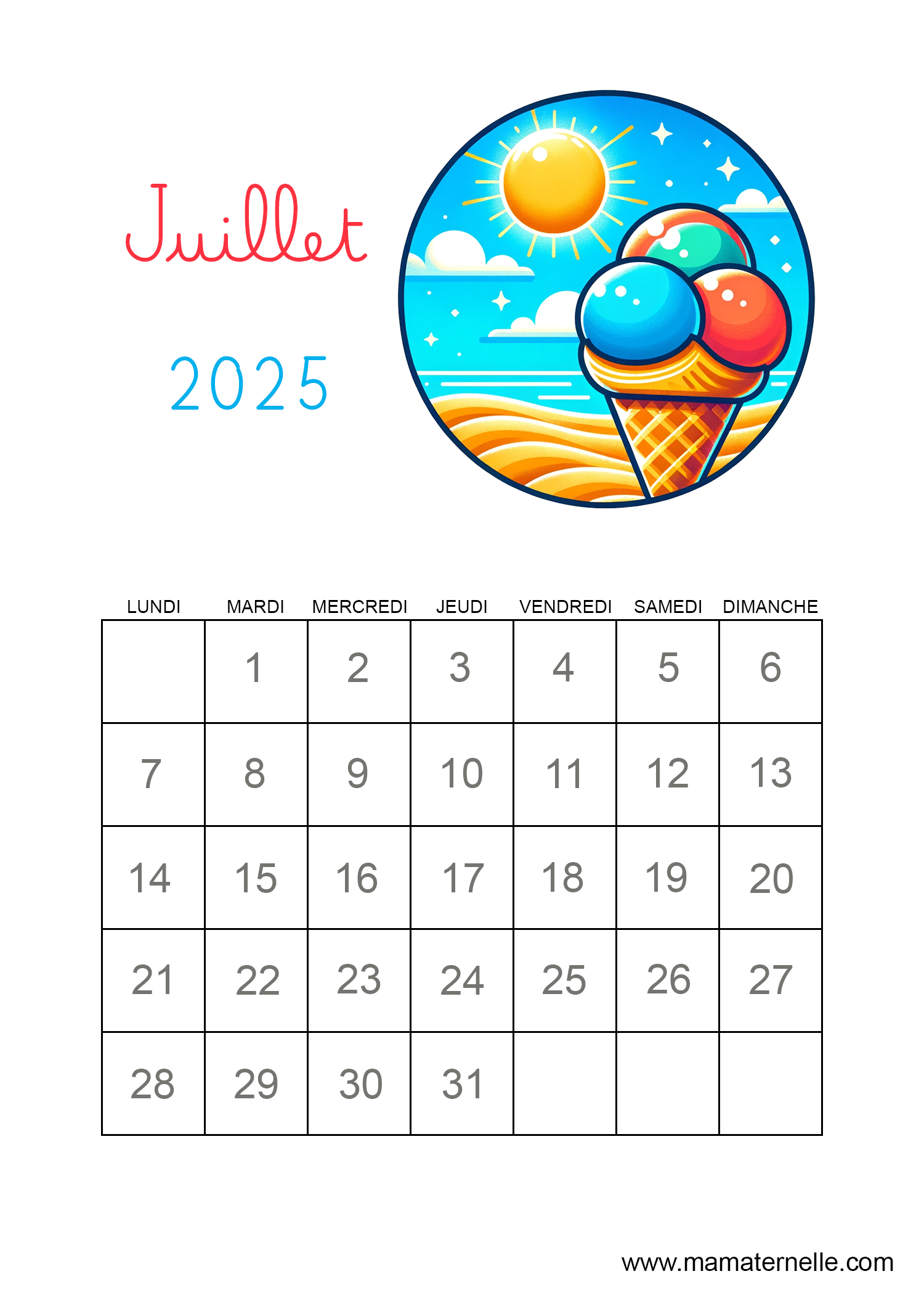 Voici le calendrier du mois de juillet 2025. À l’école il est parfois proposé aux enfants ce type de calendrier à cases afin de les aider à se repérer dans le temps. Chaque jour les petits élèves pourront faire une croix à la bonne date. Vous pouvez également y ajouter leurs activités à chaque date (sport, sorties…) les anniversaires, les fêtes, votre programme pour les vacances etc…
