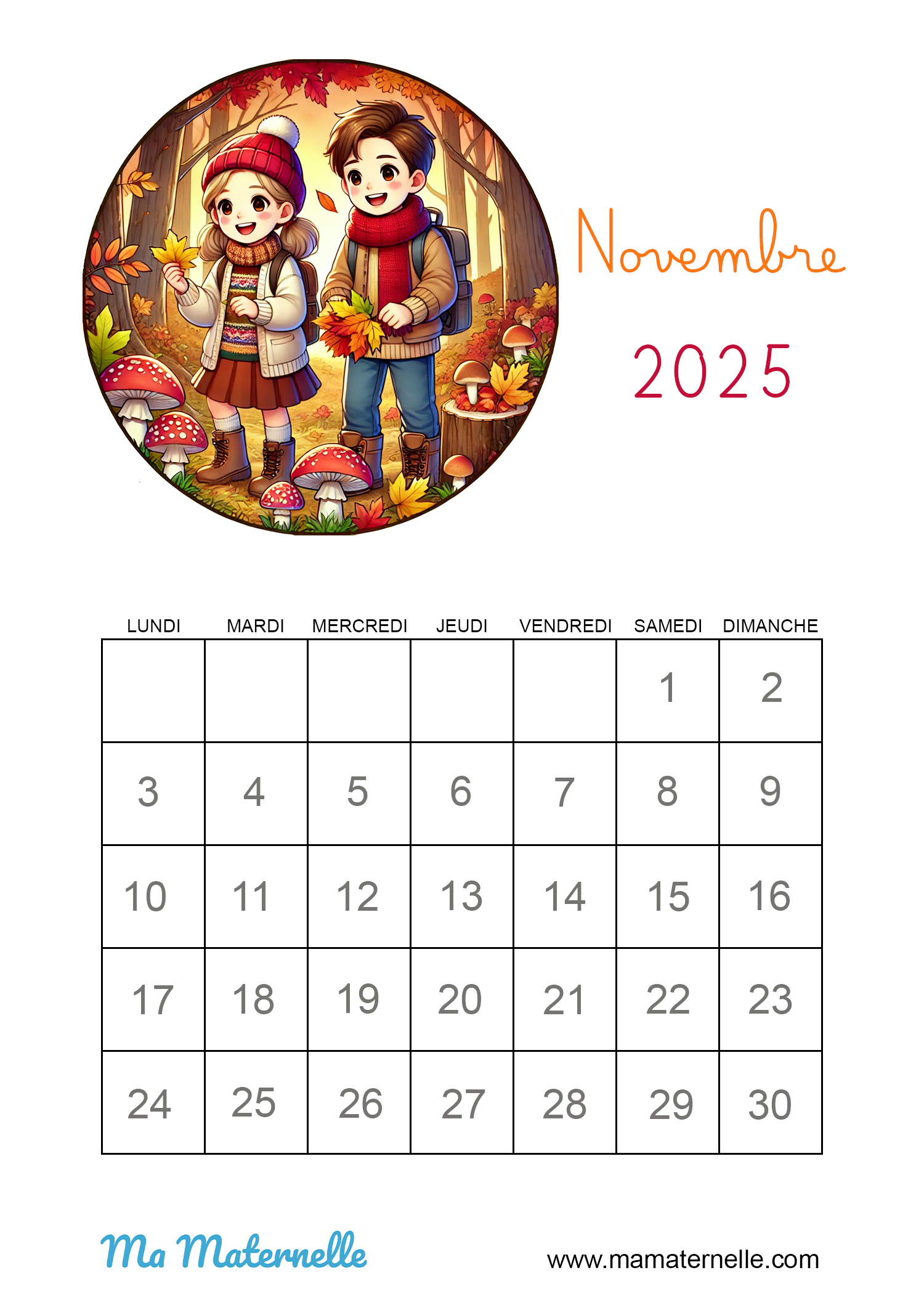 Voici le calendrier du mois de novembre 2025. À l’école il est parfois proposé aux enfants ce type de calendrier à cases afin de les aider à se repérer dans le temps. Chaque jour les petits élèves pourront faire une croix à la bonne date. Vous pouvez également y ajouter leurs activités à chaque date (sport, sorties…) les anniversaires, les fêtes, votre programme pour les vacances etc…