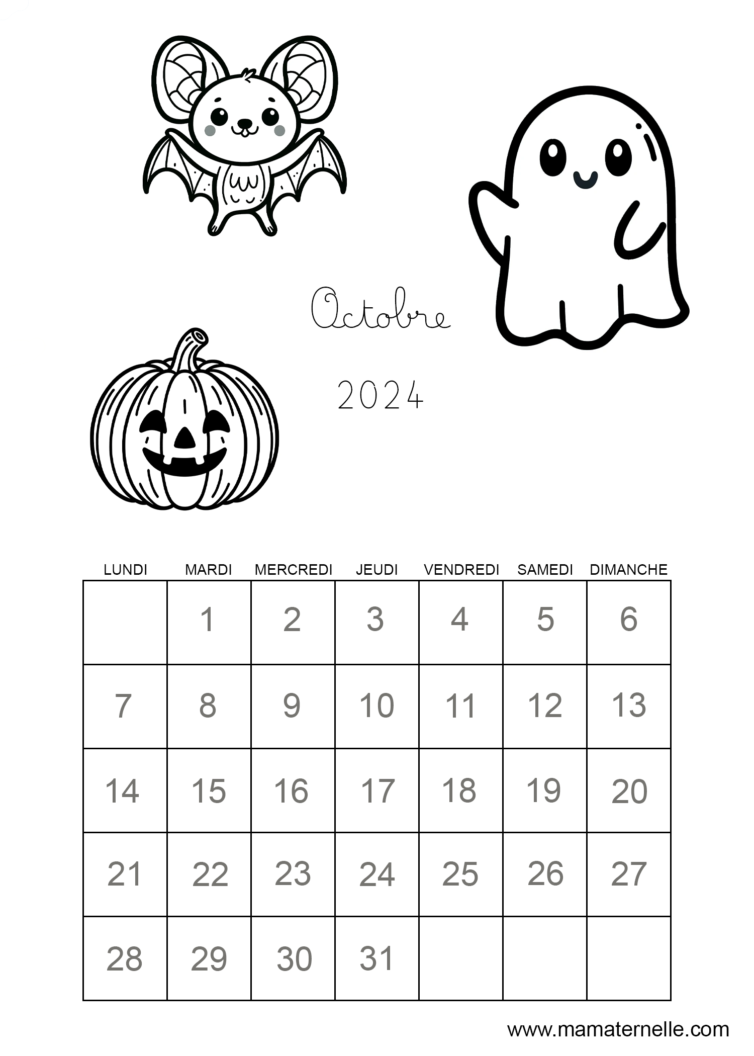 Voici le calendrier à colorier du mois d’octobre 2024. À l’école il est parfois proposé aux enfants ce type de calendrier à cases afin de les aider à se repérer dans le temps. Chaque jour les petits élèves pourront faire une croix à la bonne date. Vous pouvez également y ajouter leurs activités à chaque date (sport, sorties…) les anniversaires, les fêtes, votre programme pour les vacances etc…