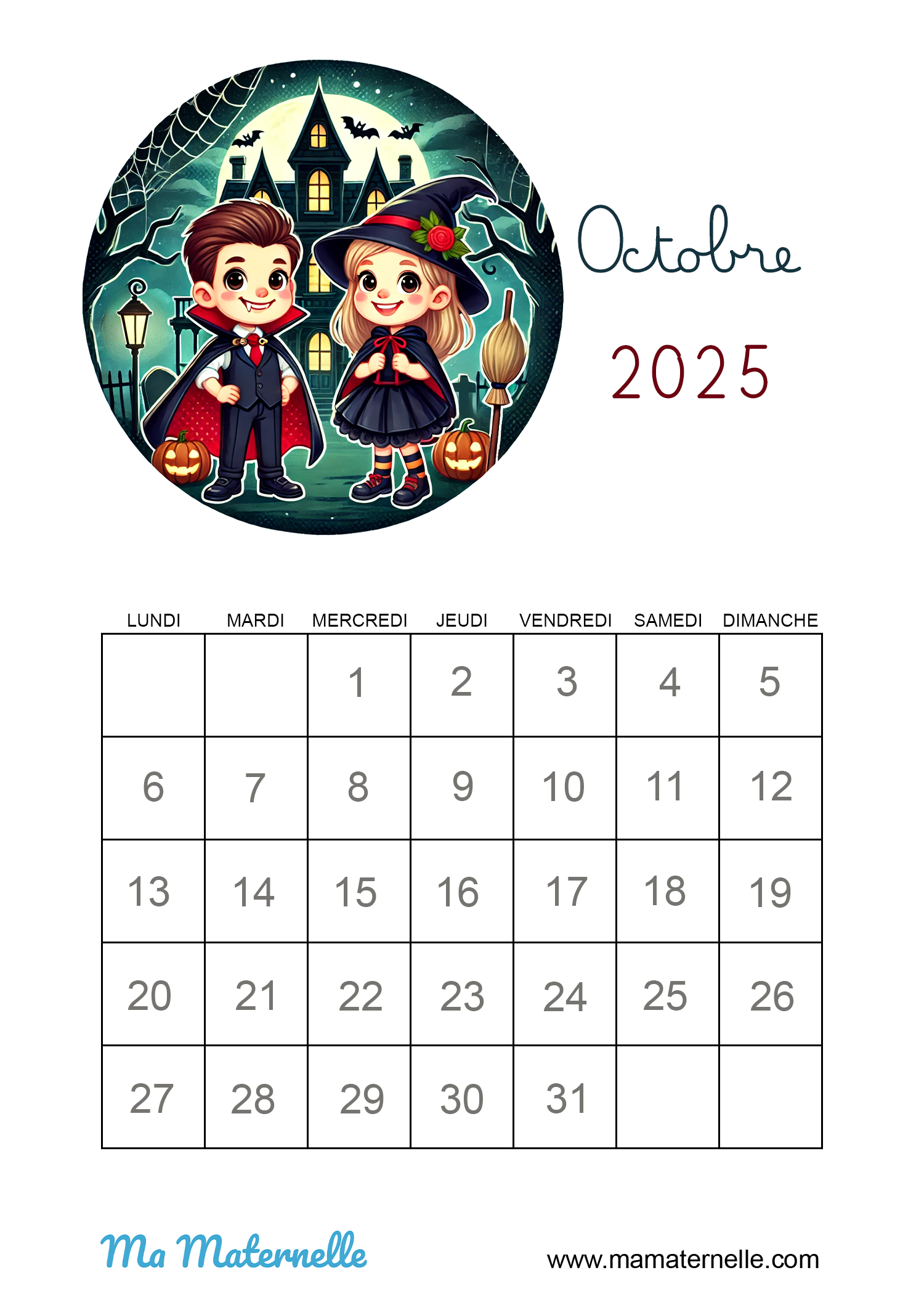 Voici le calendrier du mois d’octobre 2025. À l’école il est parfois proposé aux enfants ce type de calendrier à cases afin de les aider à se repérer dans le temps. Chaque jour les petits élèves pourront faire une croix à la bonne date. Vous pouvez également y ajouter leurs activités à chaque date (sport, sorties…) les anniversaires, les fêtes, votre programme pour les vacances etc…