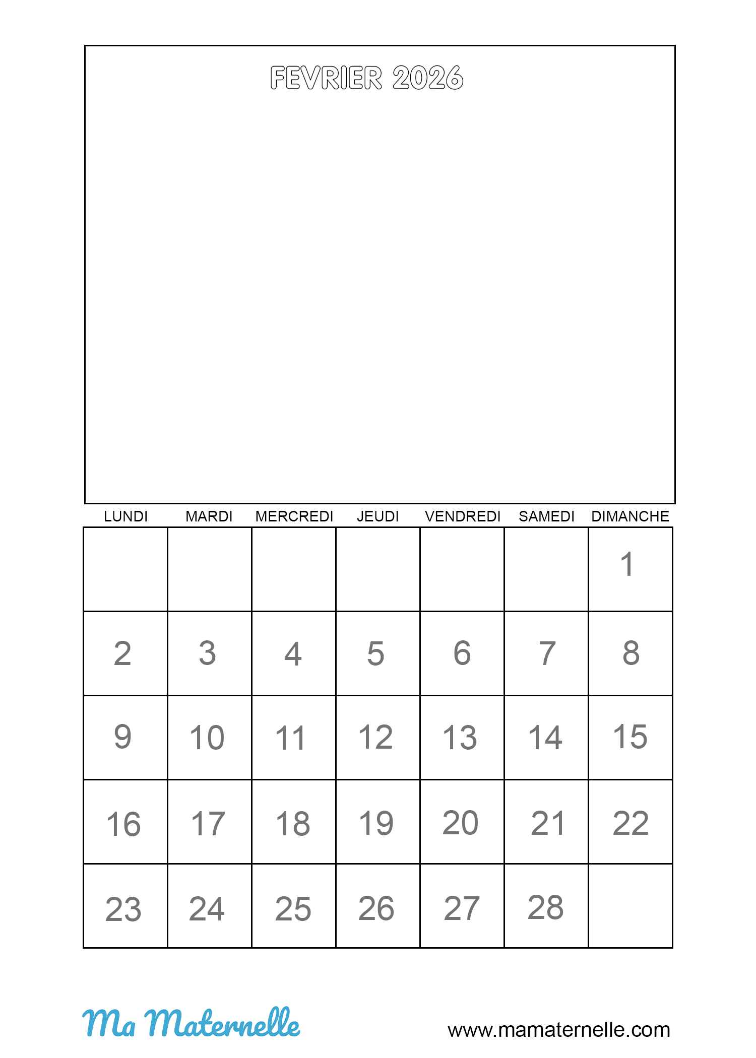 Voici le calendrier à imprimer du mois de Février 2026 vierge, pour y faire un dessin.