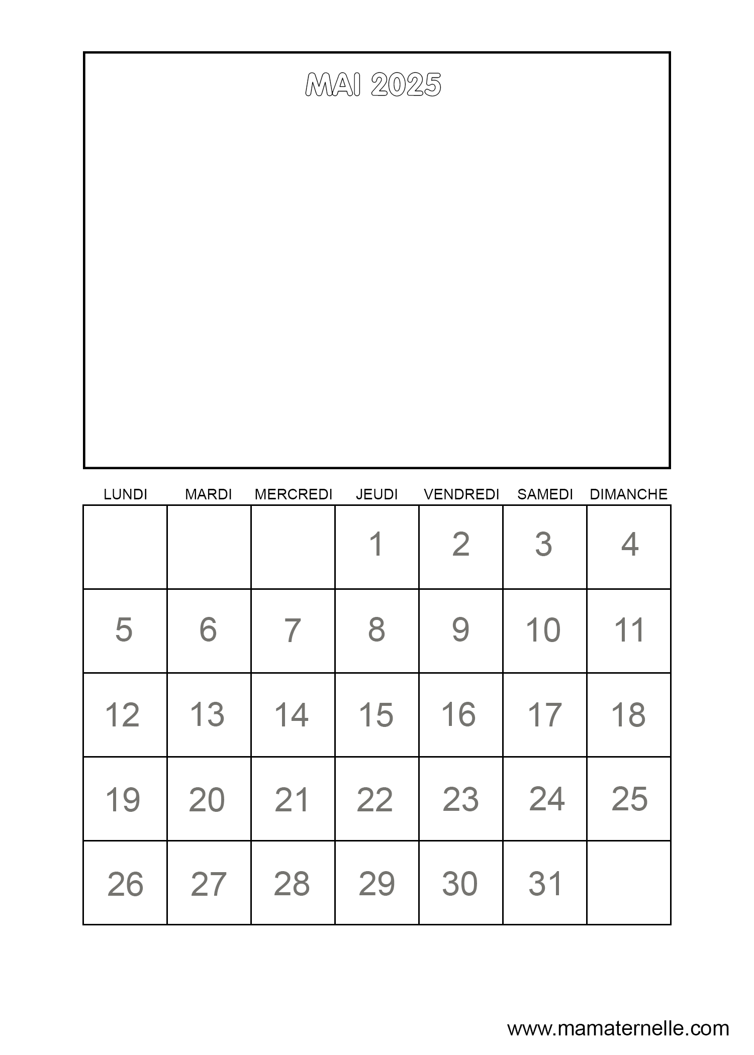 Voici le calendrier du mois de mai 2025 vierge, pour y faire un dessin. À l’école il est parfois proposé aux enfants ce type de calendrier à cases afin de les aider à se repérer dans le temps. Chaque jour les petits élèves pourront faire une croix à la bonne date. Vous pouvez également y ajouter leurs activités à chaque date (sport, sorties…) les anniversaires, les fêtes, votre programme pour les vacances etc…