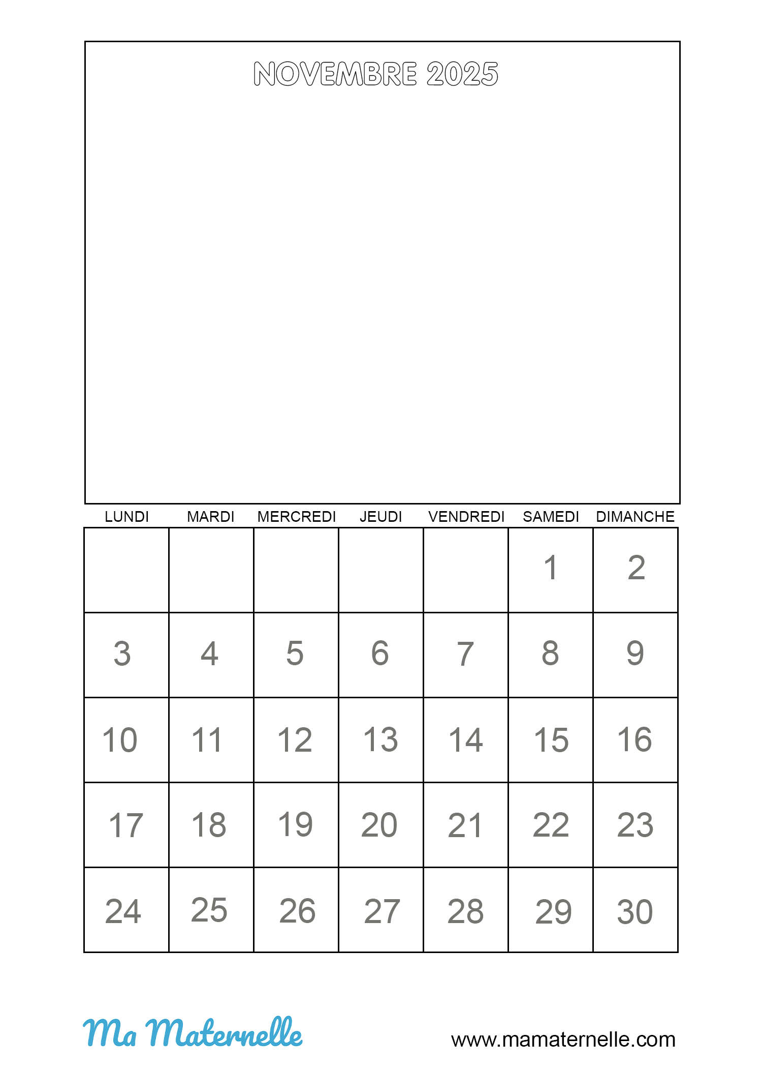 Voici le calendrier du mois de novembre 2025 vierge, pour y faire un dessin. À l’école il est parfois proposé aux enfants ce type de calendrier à cases afin de les aider à se repérer dans le temps. Chaque jour les petits élèves pourront faire une croix à la bonne date. Vous pouvez également y ajouter leurs activités à chaque date (sport, sorties…) les anniversaires, les fêtes, votre programme pour les vacances etc…