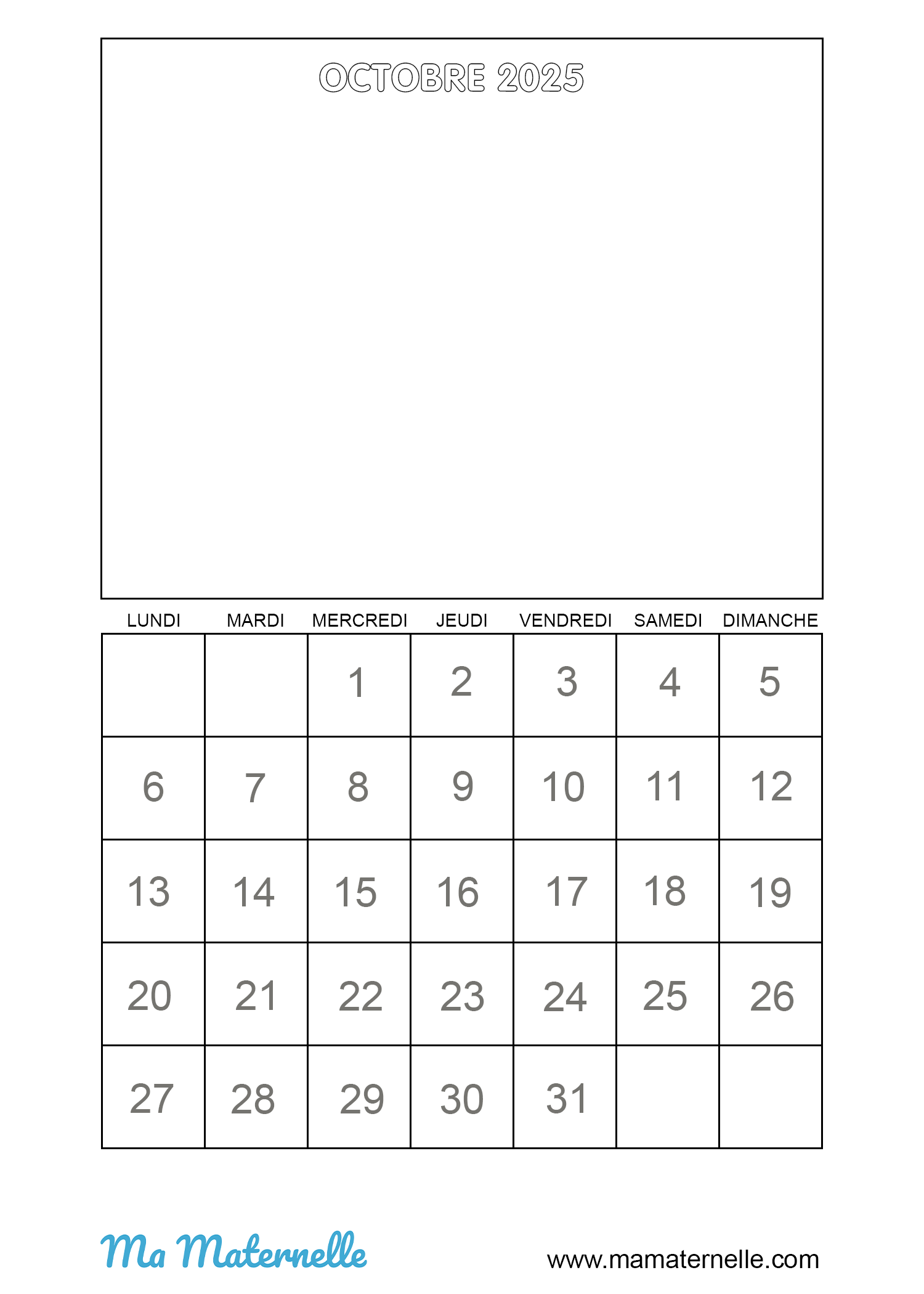 Voici le calendrier du mois d’octobre 2025 vierge, pour y faire un dessin. À l’école il est parfois proposé aux enfants ce type de calendrier à cases afin de les aider à se repérer dans le temps. Chaque jour les petits élèves pourront faire une croix à la bonne date. Vous pouvez également y ajouter leurs activités à chaque date (sport, sorties…) les anniversaires, les fêtes, votre programme pour les vacances etc…