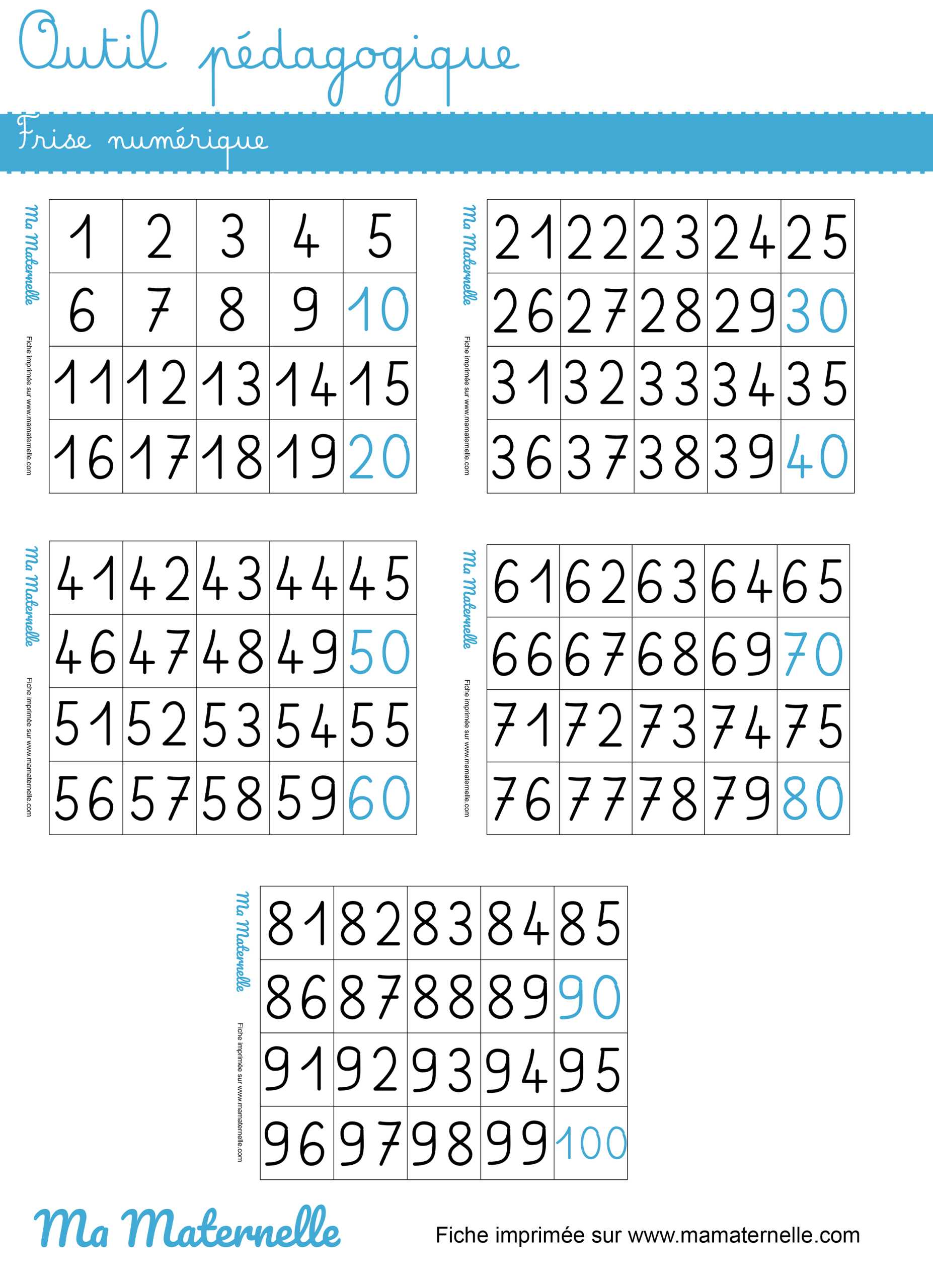 Outil pédagogique : frise numérique Par JulieLe 29 octobre 2025Dans Activités, Outils pédagogiquesLaisser un commentaire sur Outil pédagogique : frise numérique Frise numérique de 1 à 100 à imprimer en cinq pages au format PDF en cliquant sur « télécharger le fichier ». ↓ Télécharger le fichier Partager : 📎 Fiches similaires : Art : œuvre à la manière de Mondrian Activité : chandeleur Outil pédagogique : petit train de la semaine Outil pédagogique : petit train de la semaine