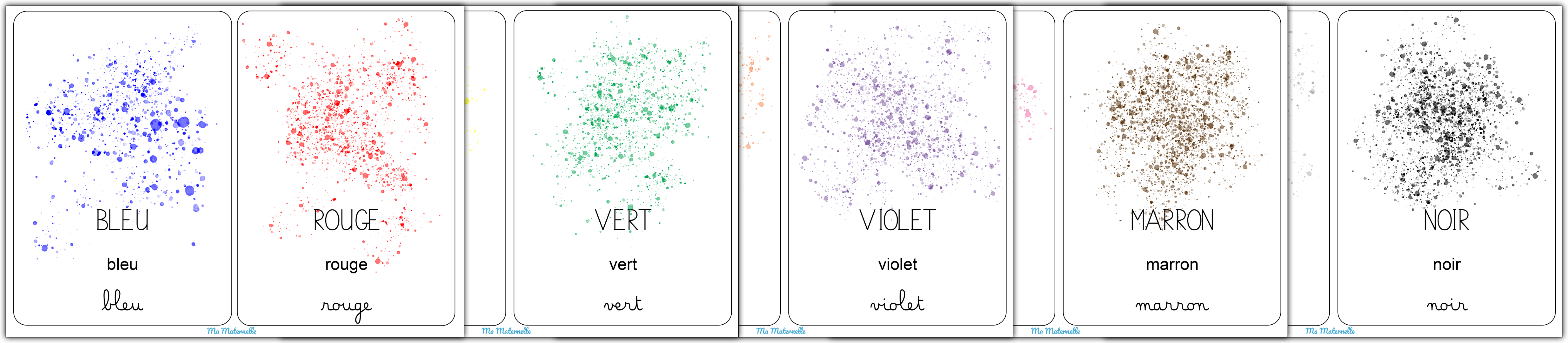 5 pages à imprimer avec deux couleurs par fiche. Bleu, rouge, jaune, vert, orange, violet, gris, rose, marron et noir.