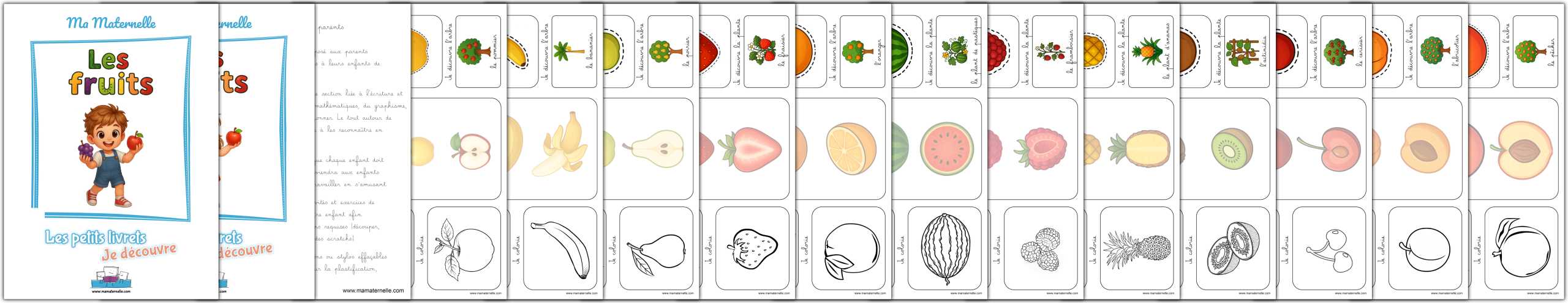 Ce livrets d’activités est composé d’une fiche par fruit, soit 14 au total, avec pour contenu :