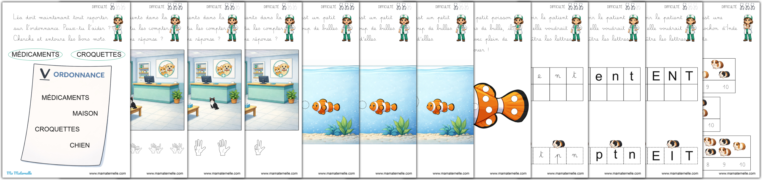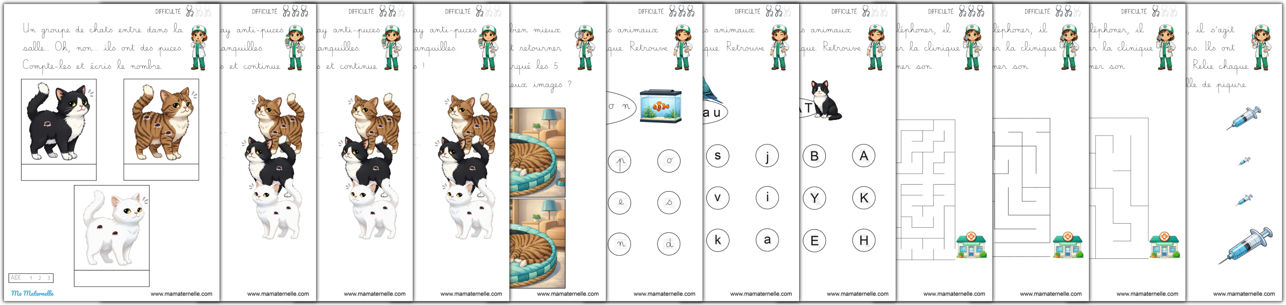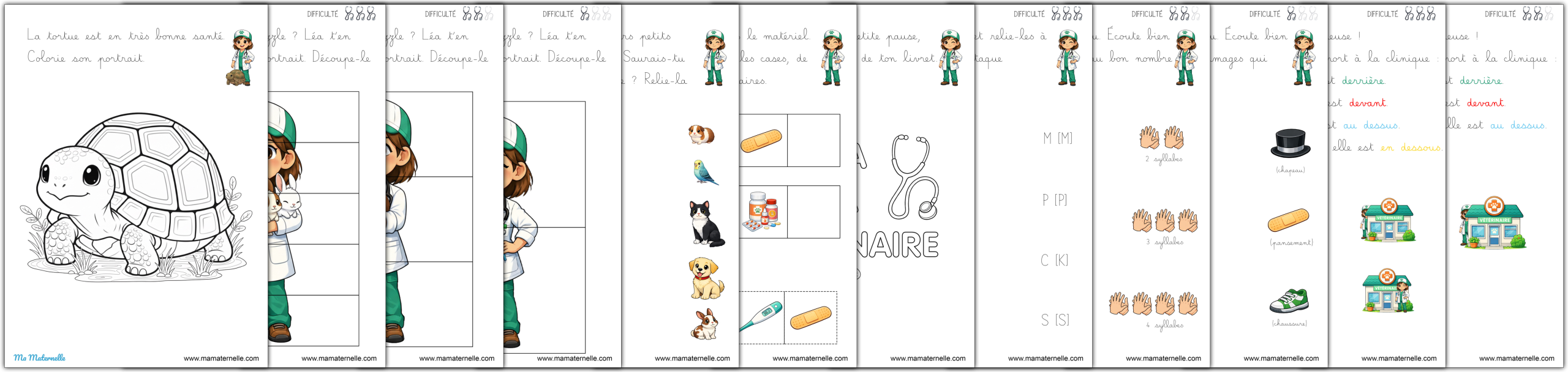 Des cartes de vocabulaire autour du thème des vétérinaires. 🩺 Des exercices autour des lettres 🔤.