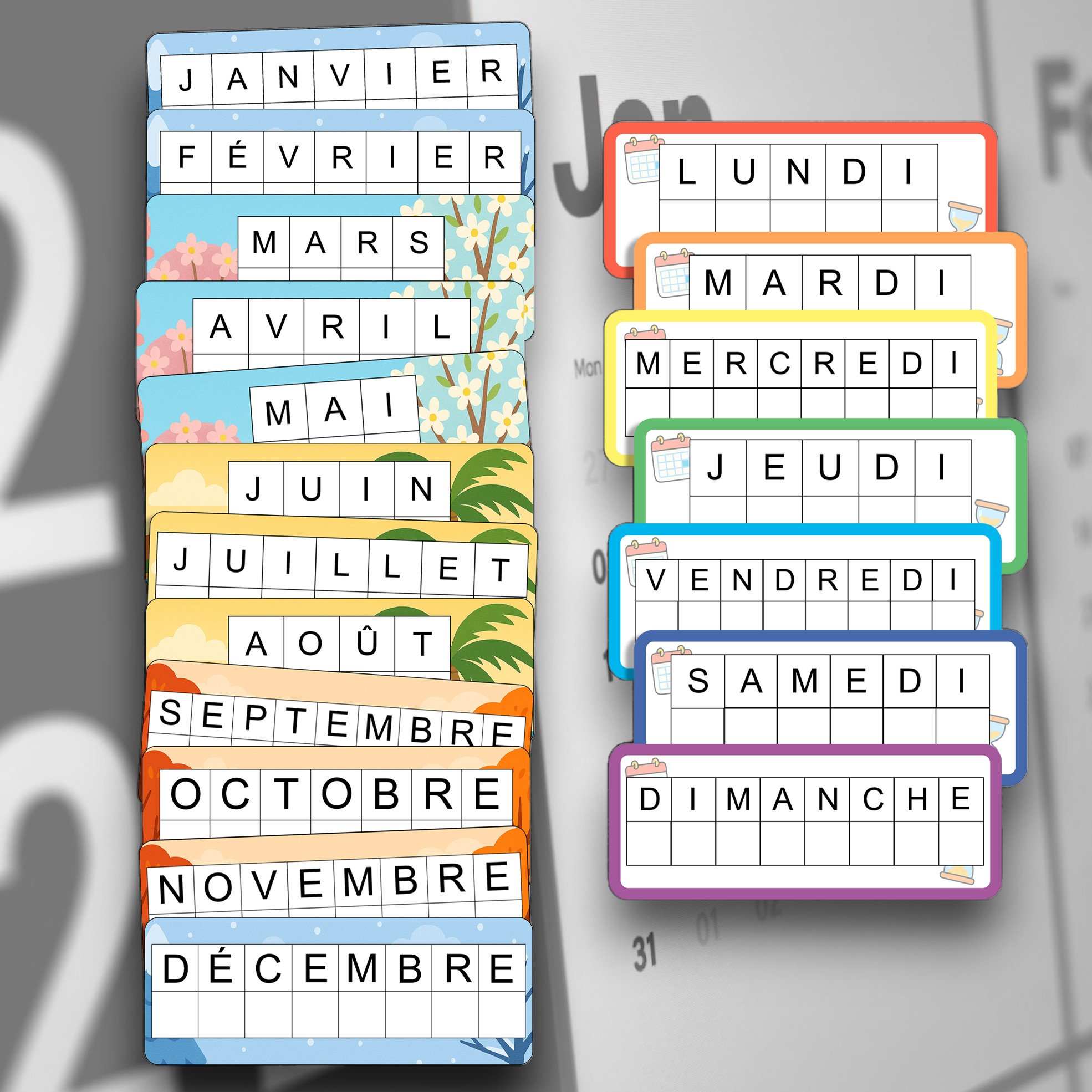 Un ensemble ludique pour apprendre à écrire les 12 mois de l’année et les 7 jours de la semaine.