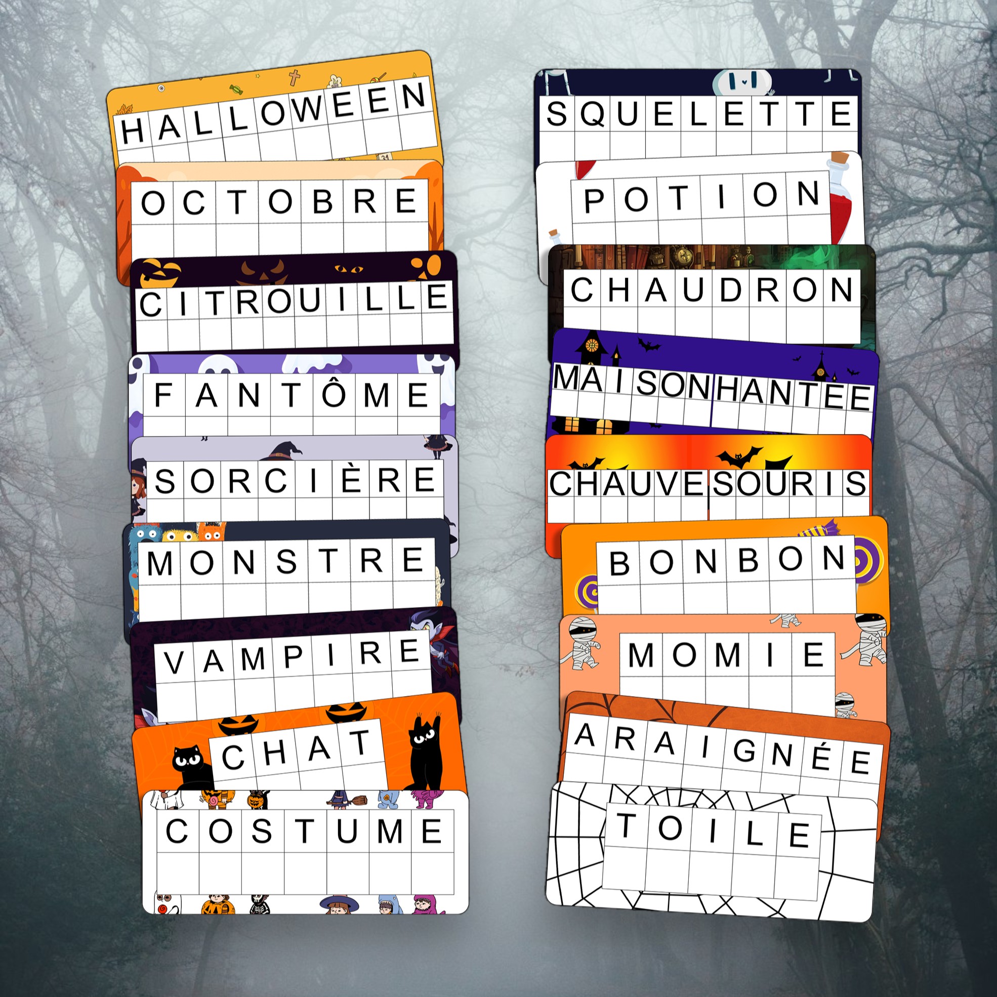 - 18 cartes avec différents mots autour de la thématique d’Halloween (citrouille, fantôme, sorcière…)