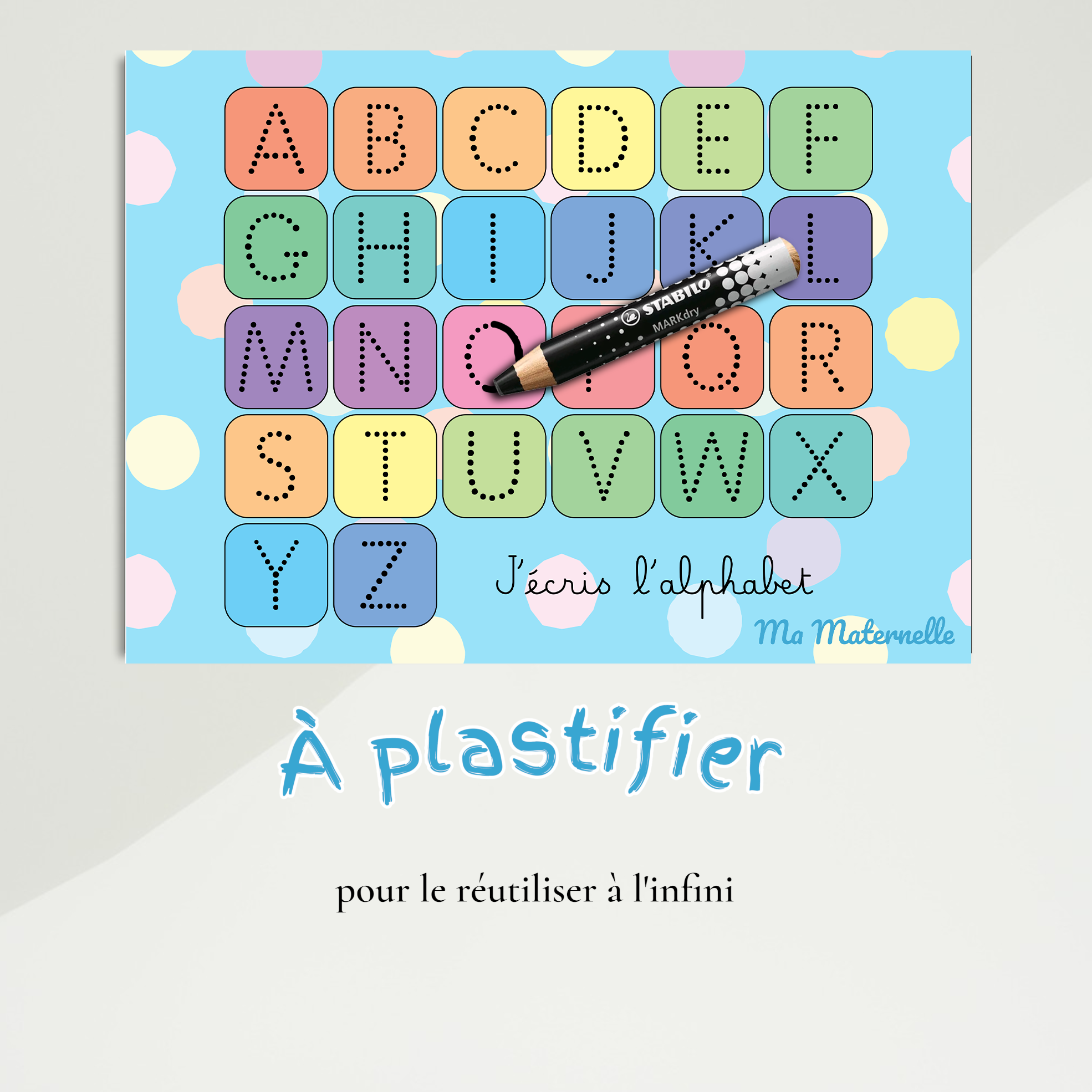 Aidez votre enfant à s’entraîner à écrire les lettres de l’alphabet grâce à cette fiche colorée et ludique. Chaque lettre, en majuscule, est formée par des pointillés pour permettre à l’enfant de repasser dessus avec son crayon et de développer sa motricité fine tout en apprenant les bases de l’écriture.