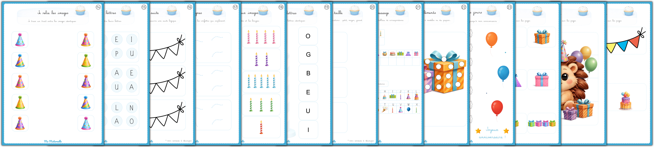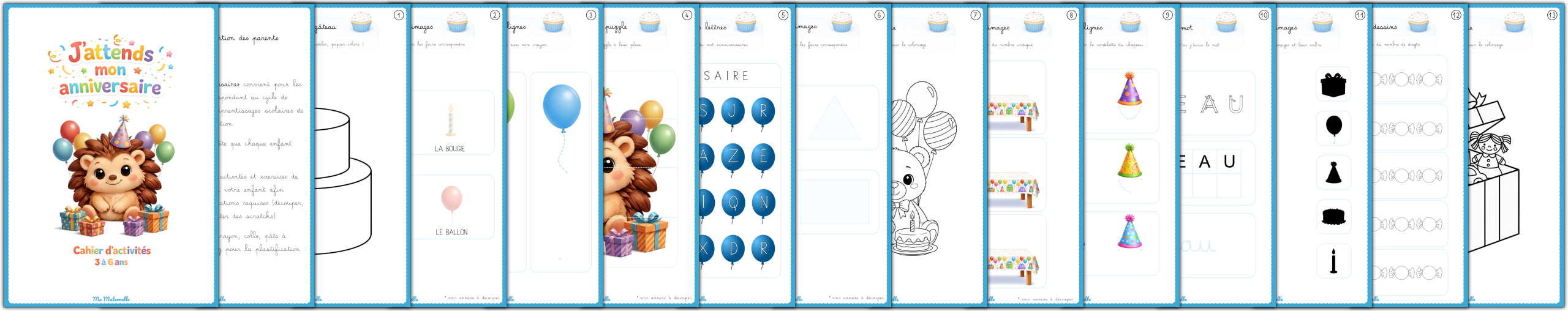 Avec ce livret, faites patienter votre enfant jusqu’à son anniversaire en s’amusant. Il contient 23 pages variées : décorations sur le gâteau, placement d’images, graphisme, et plus. Plastifiez-le pour que votre enfant puisse recommencer les activités à l’infini.
