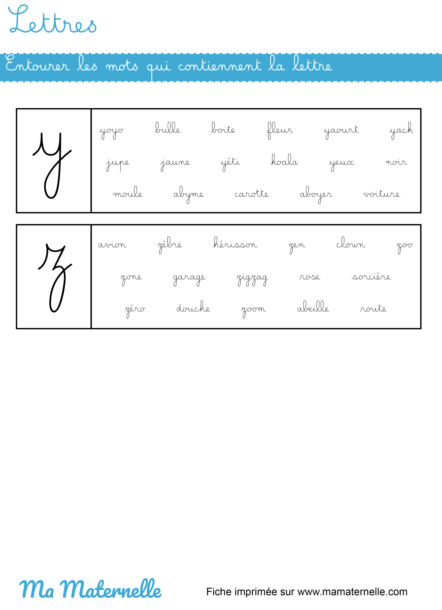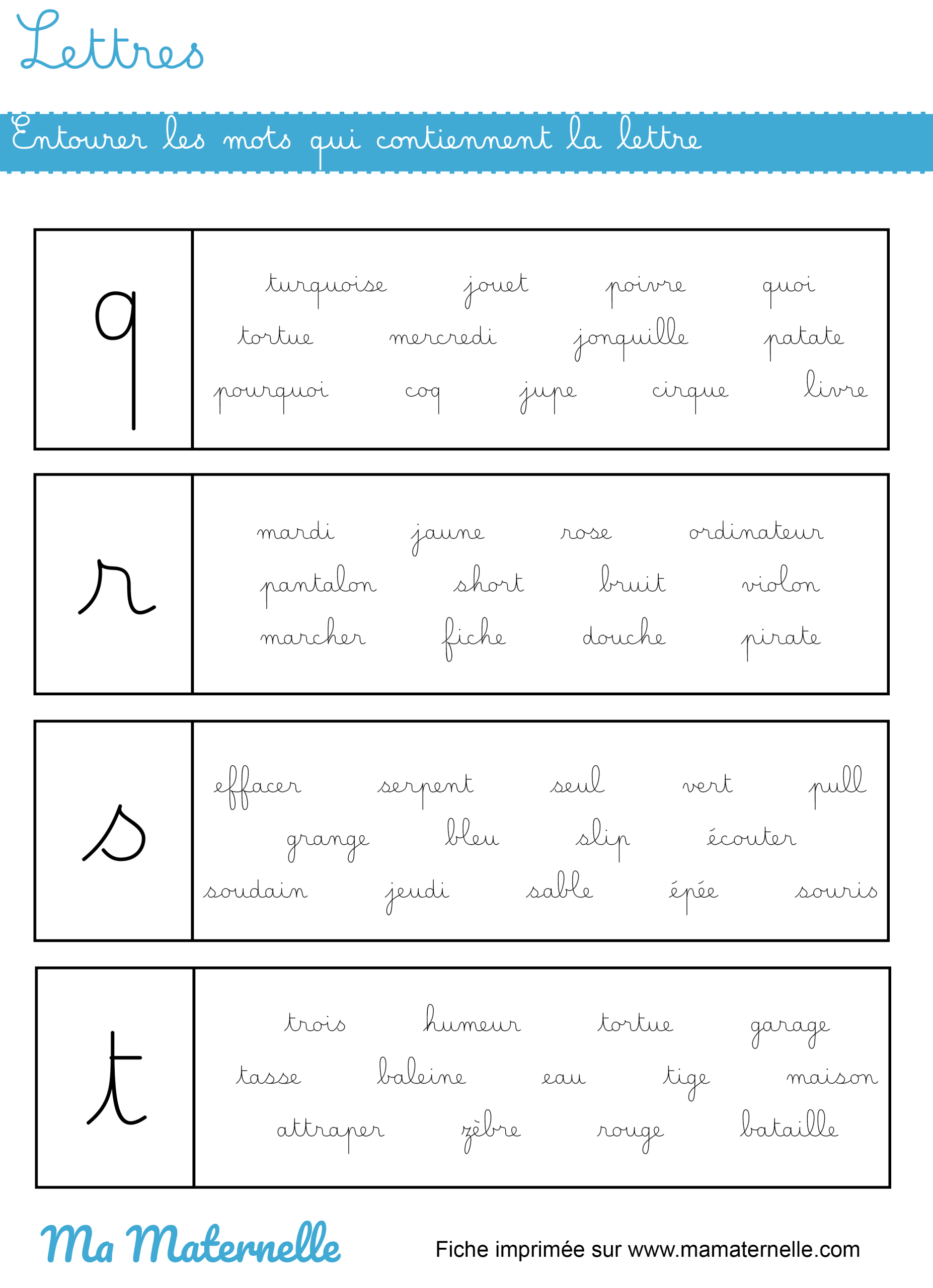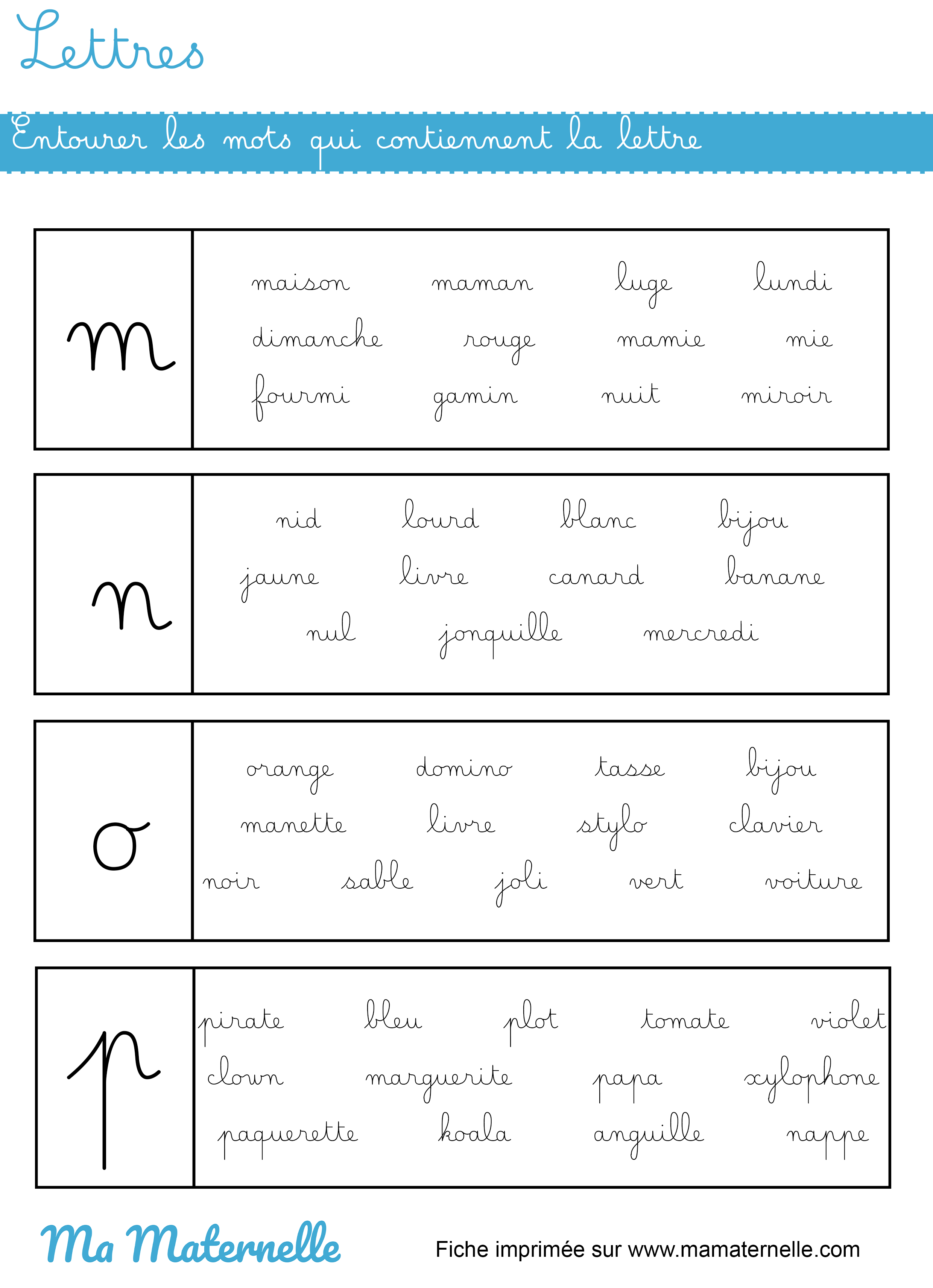 En petite section, ce sont les lettres capitales qui sont utilisées, les petits élèves découvrent leurs formes et finissent par les associer aux sons. En moyenne section, ce sont les lettres scripts qui font leur apparition jusqu’en grande section. Ce n’est qu’à la fin de cette dernière année que certains professeurs démarrent avec les lettres cursives en minuscules.