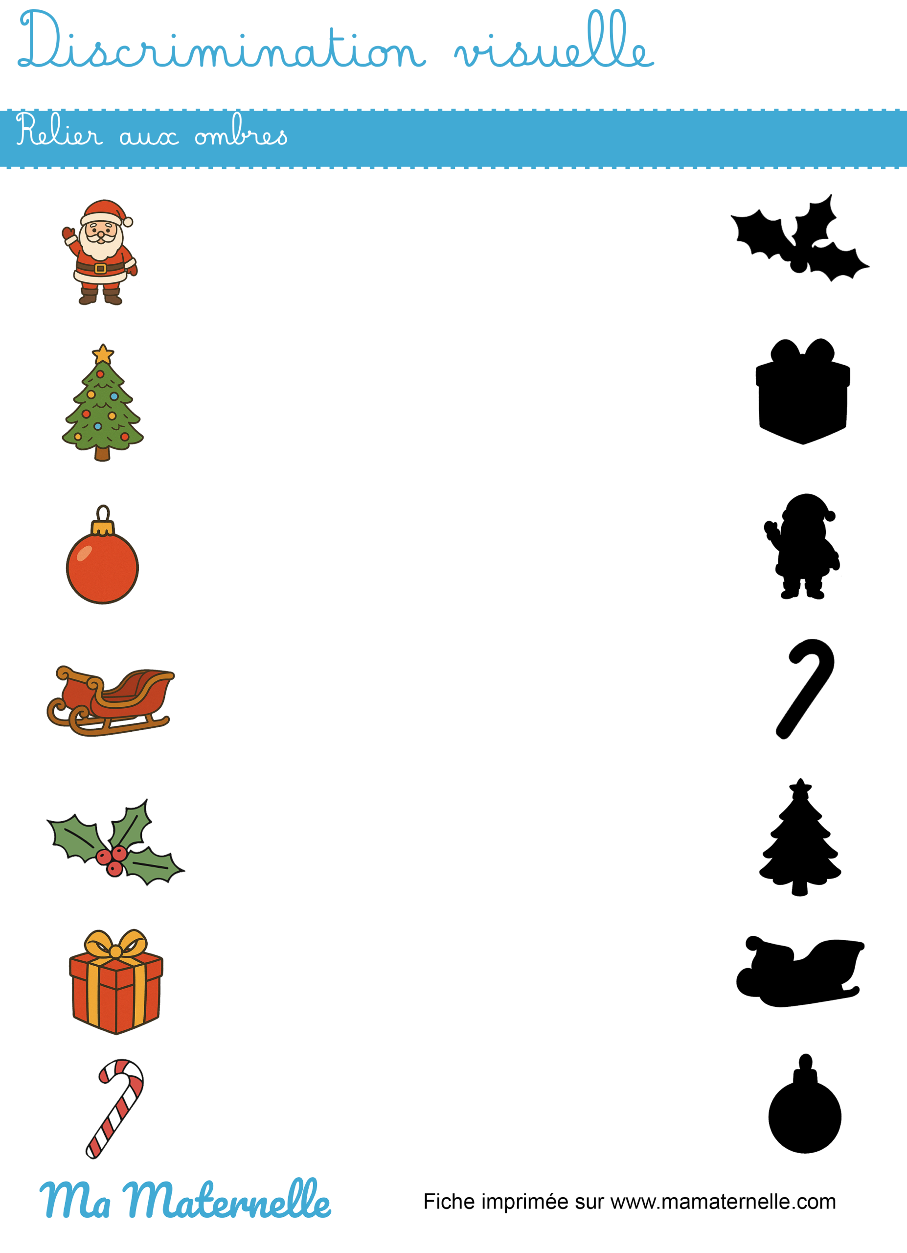 Discrimination visuelle : relier aux ombres Par JulieLe 25 décembre 2025Dans Discrimination visuelle grande section, Grande sectionLaisser un commentaire sur Discrimination visuelle : relier aux ombres Relier aux ombres sur le thème de Noël. ↓ Télécharger le fichier Partager : 📎 Fiches similaires : Mathématiques : entourer « derrière » Lettres : découper et replacer aux bons endroits Outil pédagogique : les nombres Discrimination visuelle : faire correspondre les images