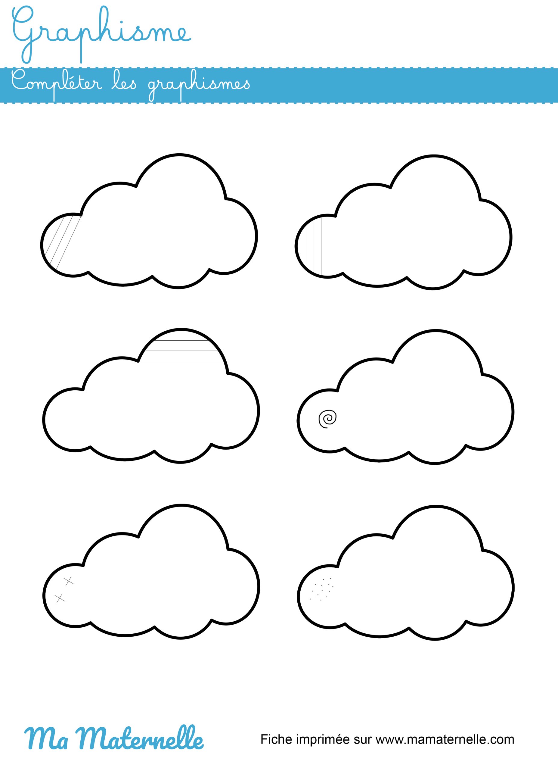 Graphisme : compléter les graphismes Par JulieLe 30 décembre 2025Dans Grande section, Graphisme grande sectionLaisser un commentaire sur Graphisme : compléter les graphismes Compléter les différents graphismes sur les nuages. ↓ Télécharger le fichier Partager : 📎 Fiches similaires : Graphisme : repasser sur les lignes Lettres : le chemin du j Mon bonhomme du mois de janvier Graphisme : compléter les graphismes