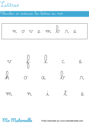 Une fois de plus, les lettres cursives sont dans un premier temps abordées via le prénom de l’enfant. Ainsi, il pourra s’approprier une part de cet apprentissage. Par la suite, on pourra reprendre les exercices de l’année passée en introduisant cette nouvelle forme d’écriture. Le but étant d’effectuer une comparaison avec les lettres majuscules et minuscules, déjà maîtrisées. On pourra alors proposer à l’enfant de retrouver un mot parmi d’autres, de colorier les lettres qui composent un mot, de faire correspondre un mot avec son équivalent dans un autre style d’écriture, etc…
