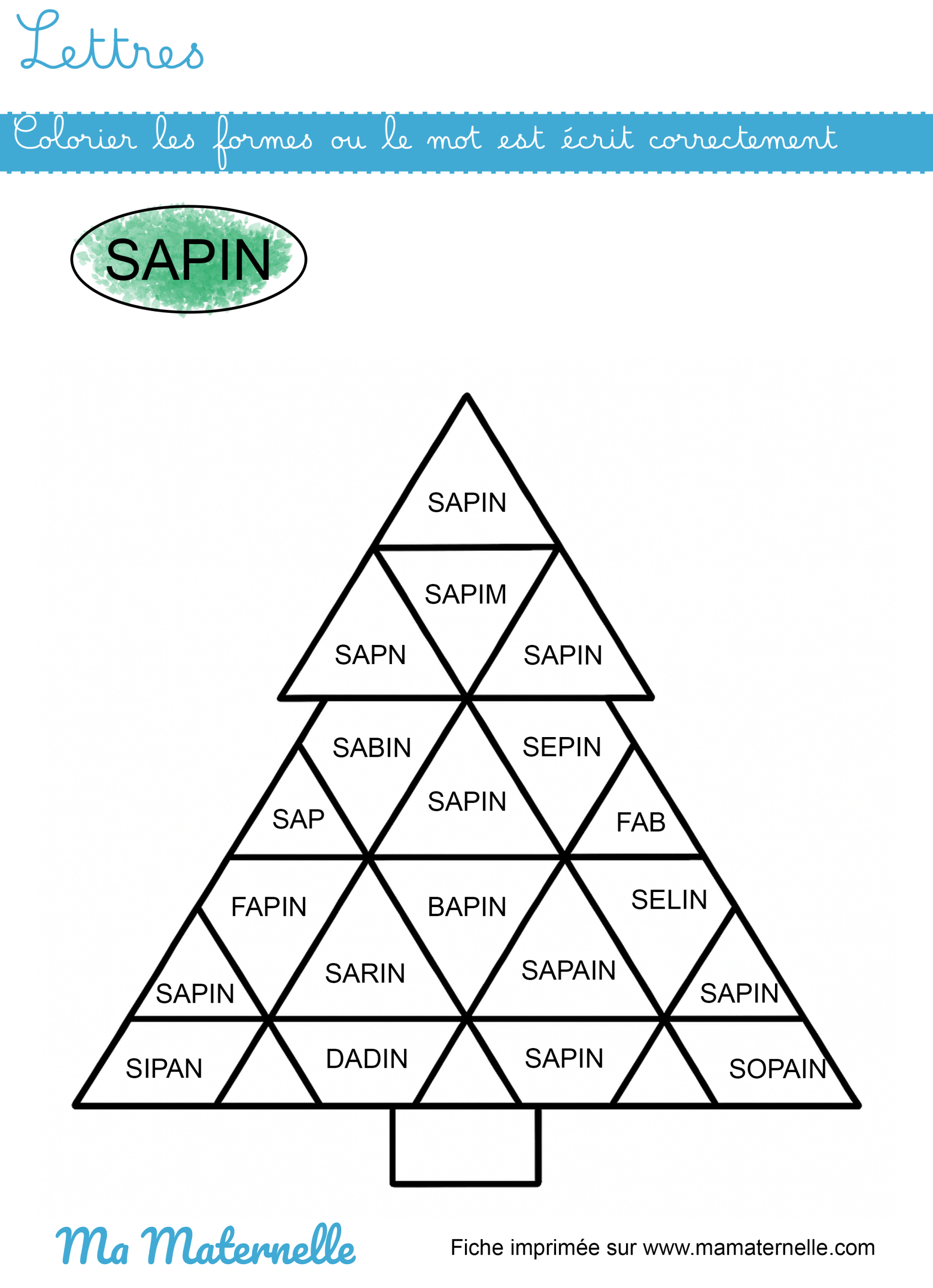 Colorier les formes ou le mot « sapin » est écrit correctement.