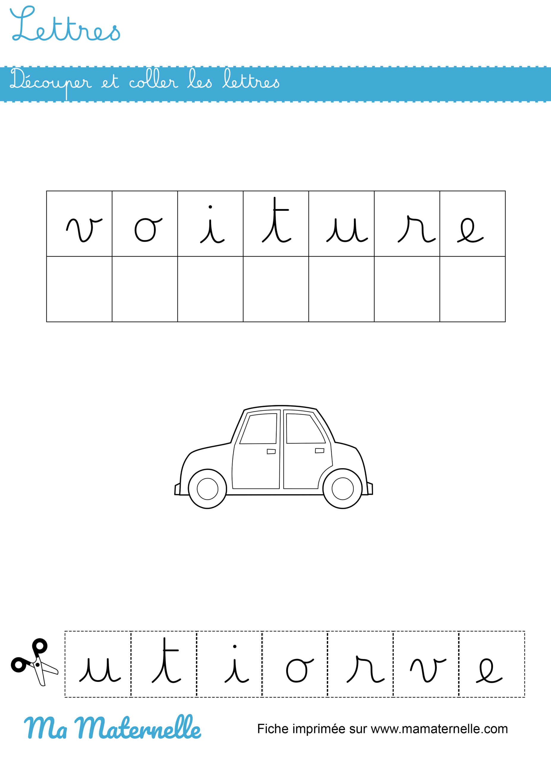Découper et coller les lettres du mot « voiture » en lettres cursives.