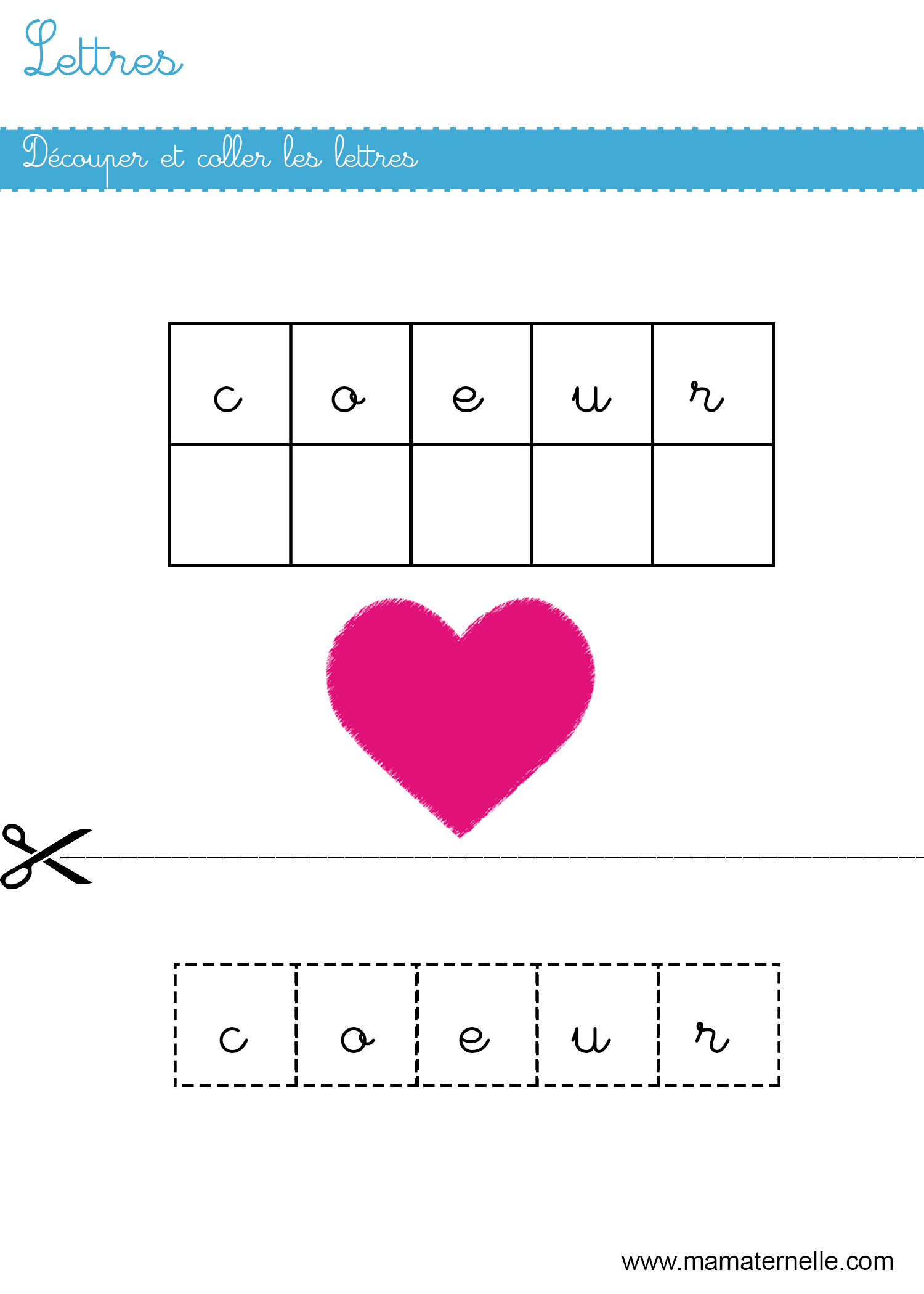 Exercice de graphisme sur le thème de la saint valentin, ici nous allons découper les lettres du mot coeur et les coller dans le bon ordre.