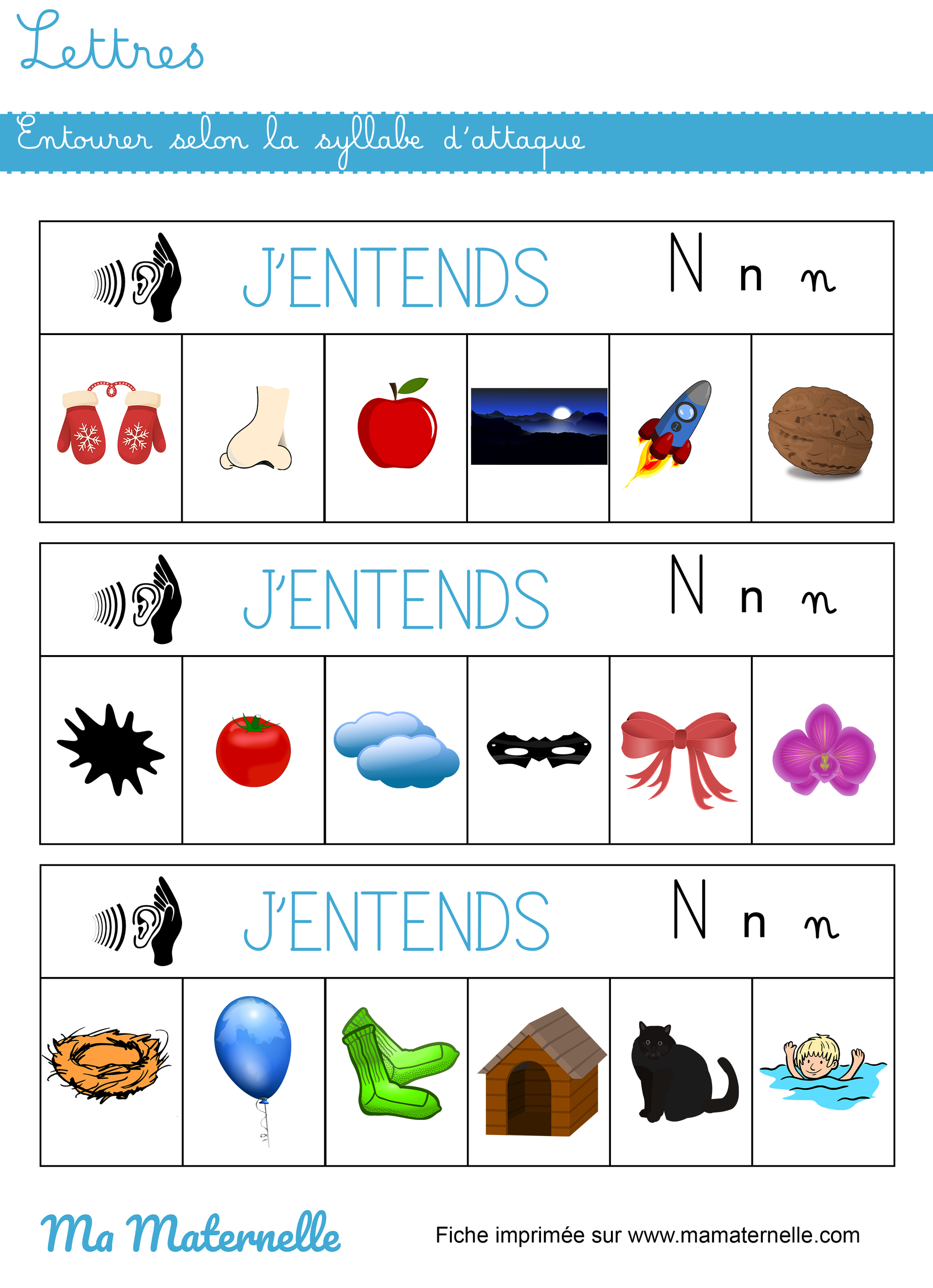 Entourer les images selon la syllabe d’attaque indiquée. Voici « N ».