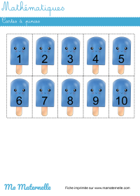 Ici il faudra découper les cartes, puis placer des pinces à linge sur chaque glace en fonction du nombre de doigts indiqué. Si vous n’avez pas de pince, utilisez des jetons. N’hésitez pas à plastifier cette activité afin qu’elle dure dans le temps.