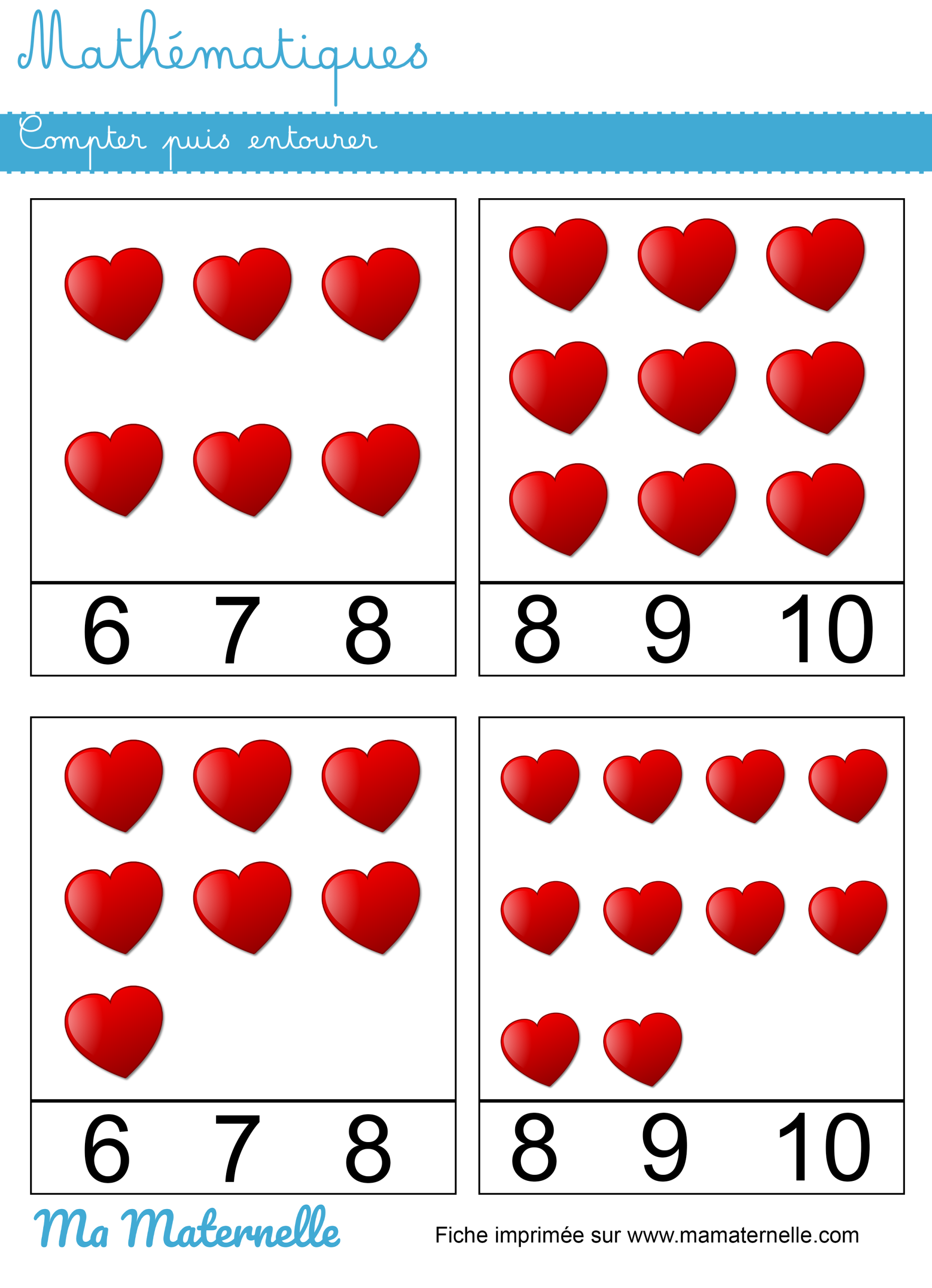 Compter puis entourer les quantités de coeurs de saint valentin.