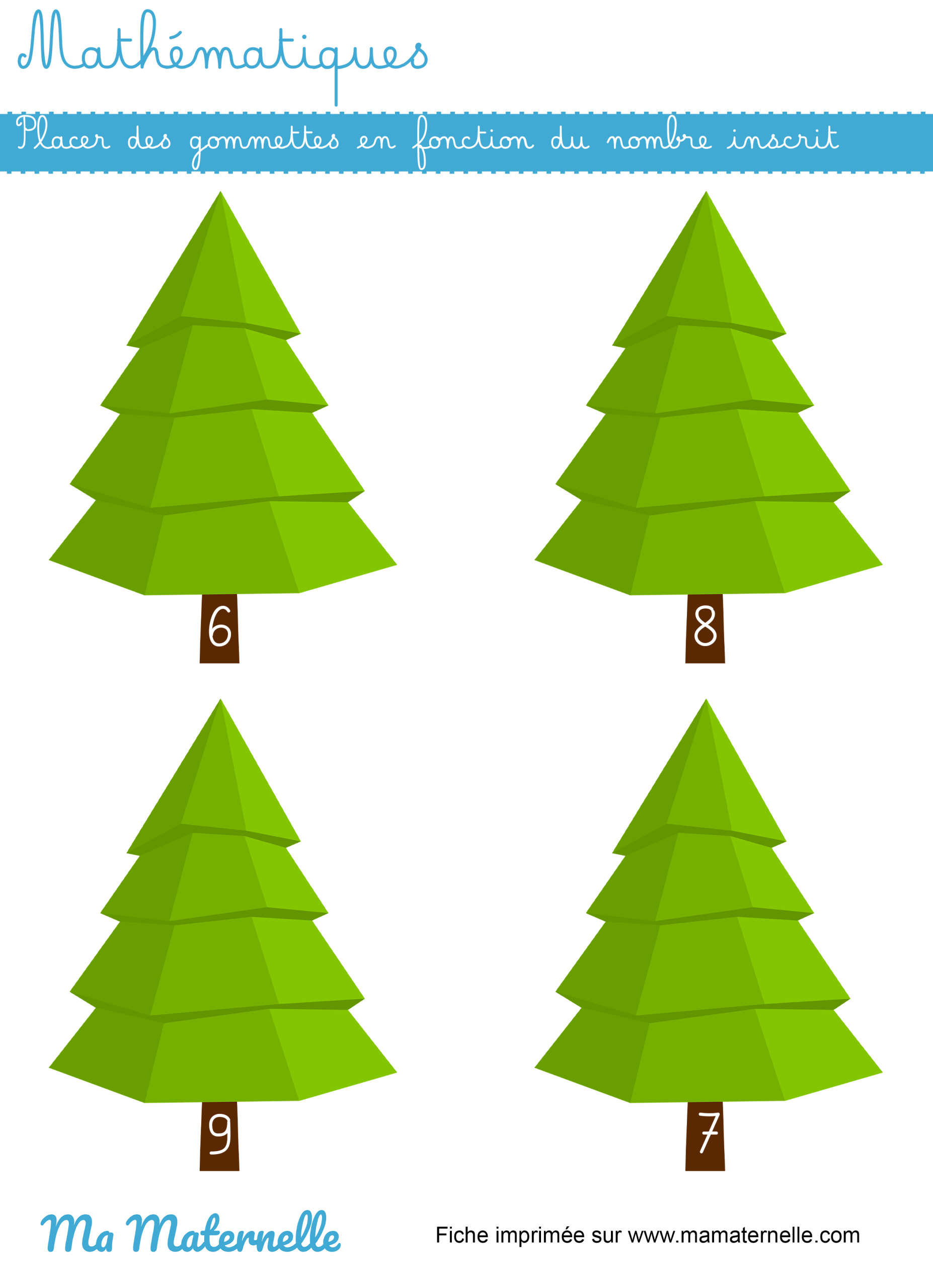 Objectifs : travailler la motricité fine avec le placement des gommettes. Associer une quantité à un nombre. Renforcer la connaissance des chiffres (6, 7, 8 et 9).
