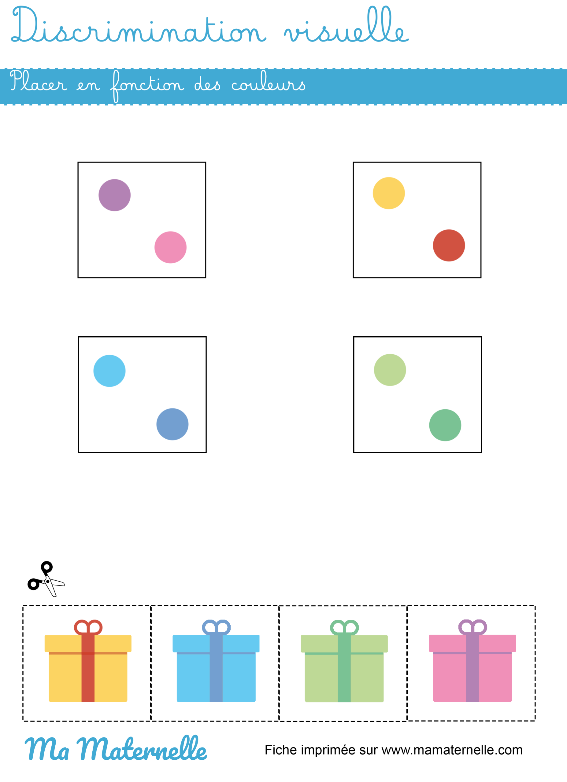Discrimination visuelle : placer en fonction des couleurs Par JulieLe 5 janvier 2026Dans Discrimination visuelle moyenne section, Moyenne sectionLaisser un commentaire sur Discrimination visuelle : placer en fonction des couleurs Placer les cadeaux en fonction des couleurs après les avoir découpé. ↓ Télécharger le fichier Partager : 📎 Fiches similaires : Discrimination visuelle : relier aux ombres Discrimination visuelle : découper et placer Discrimination visuelle : entourer l’intrus Discrimination visuelle : découper et placer en fonction du sens