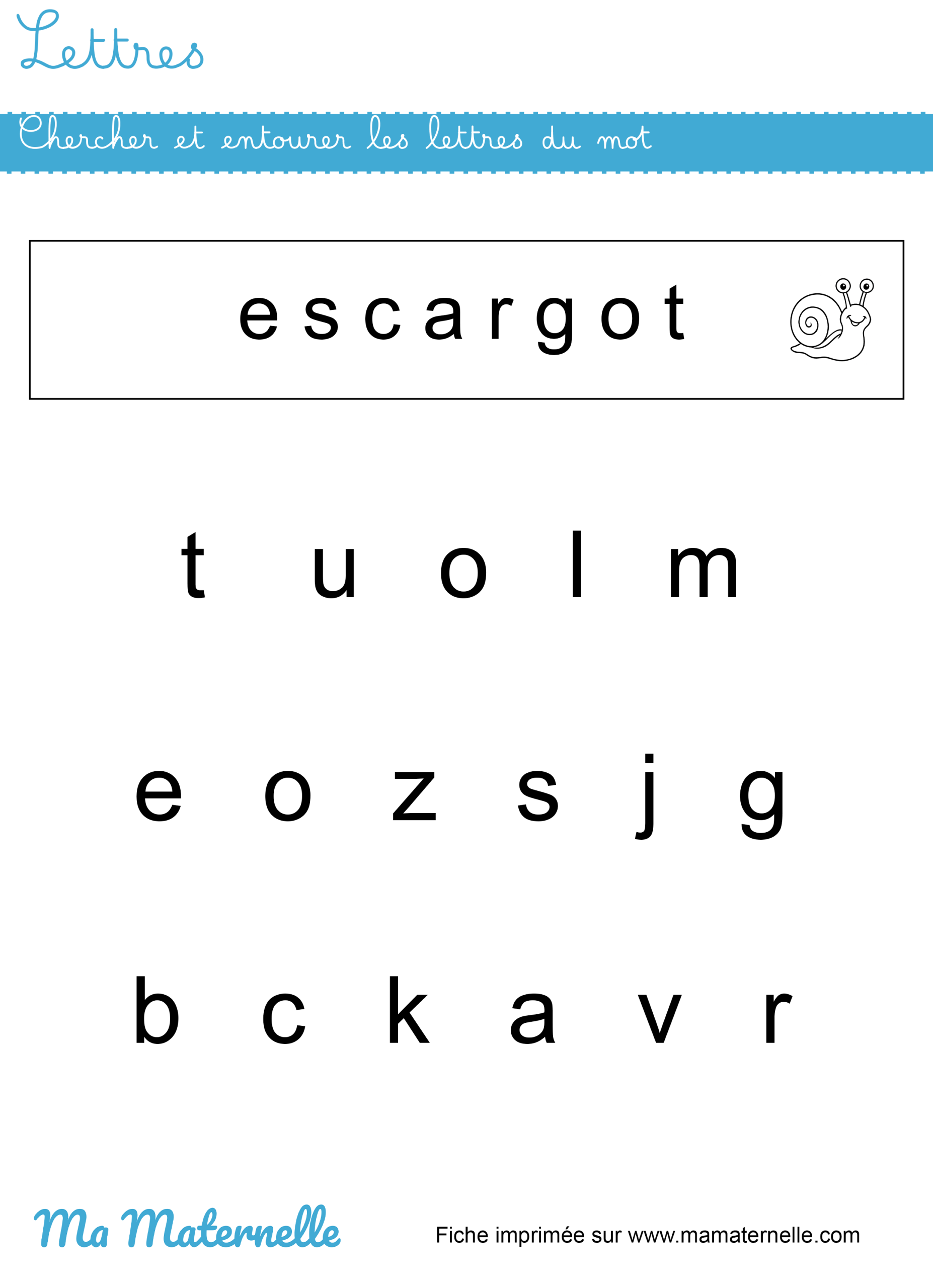Lettres : chercher et entourer les lettres du mot Par JulieLe 4 novembre 2025Dans Lettres moyenne section, Moyenne sectionLaisser un commentaire sur Lettres : chercher et entourer les lettres du mot Chercher et entourer les lettres du mot escargot en script. ↓ Télécharger le fichier Partager : 📎 Fiches similaires : Lettres : écrire les mots Lettres : chercher et entourer les lettres du mot Lettres : chercher et entourer les lettres du mot Lettres : chercher et entourer les lettres du mot