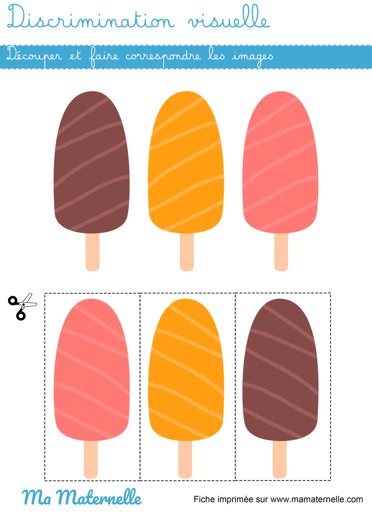 Discrimination visuelle : faire correspondre Par JulieLe 2 juillet 2024Dans Discrimination visuelle petite section, Petite sectionLaisser un commentaire sur Discrimination visuelle : faire correspondre Découper et faire correspondre les glaces en fonction de leur couleur. ↓ Télécharger le fichier Partager : 📎 Fiches similaires : Discrimination visuelle : faire correspondre Discrimination visuelle : faire correspondre Discrimination visuelle : découper et faire correspondre Discrimination visuelle : découper et faire correspondre