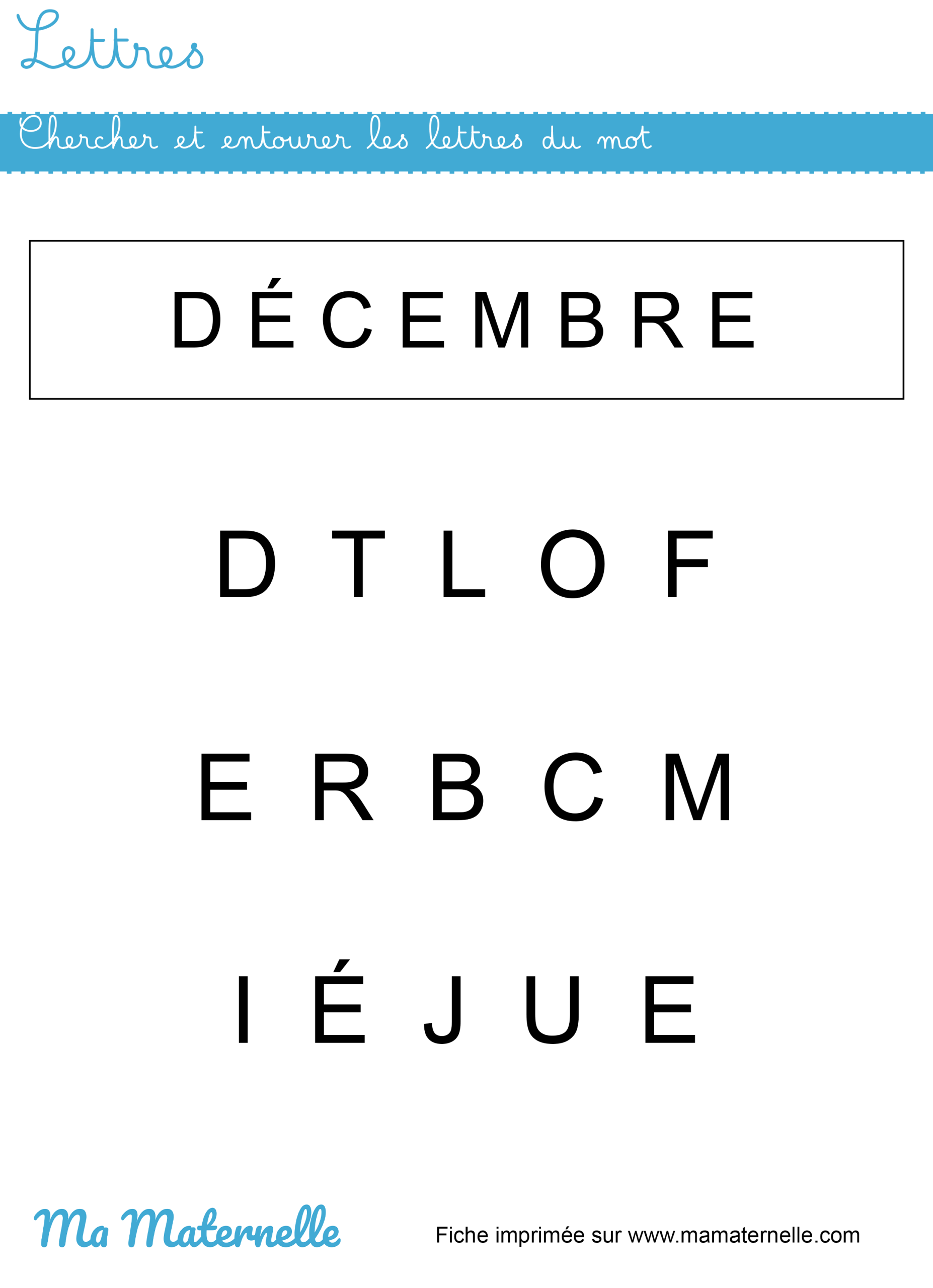 Lettres : chercher et entourer les lettres du mot Par JulieLe 27 novembre 2025Dans Lettres petite section, Petite sectionLaisser un commentaire sur Lettres : chercher et entourer les lettres du mot Chercher et entourer les lettres du mot « décembre ».Objectif : reconnaître des lettres parmi d’autres. ↓ Télécharger le fichier Partager : 📎 Fiches similaires : Lettres : chercher et entourer les lettres du mot Lettres : chercher et entourer les lettres du mot Lettres : chercher et entourer les lettres du mot Lettres : chercher et entourer les lettres du mot