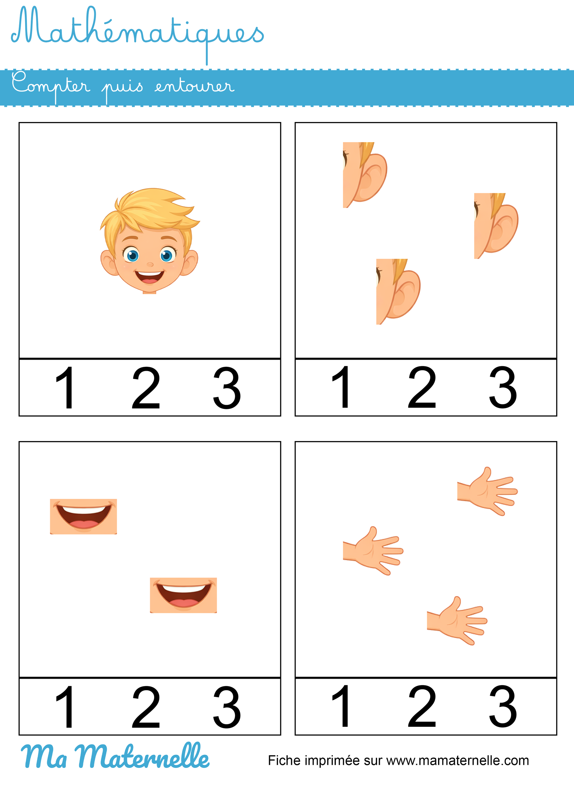 Mathématiques : compter puis entourer Par JulieLe 17 avril 2026Dans Chiffres petite section, Petite sectionLaisser un commentaire sur Mathématiques : compter puis entourer Compter et entourer le nombre sur le thème du corps humain.Objectif : travailler le dénombrement. ↓ Télécharger le fichier Partager : 📎 Fiches similaires : Chiffres : compter puis entourer la réponse Chiffres : compter puis entourer le chiffre Chiffres : compter puis entourer la bonne réponse Chiffres : compter puis entourer